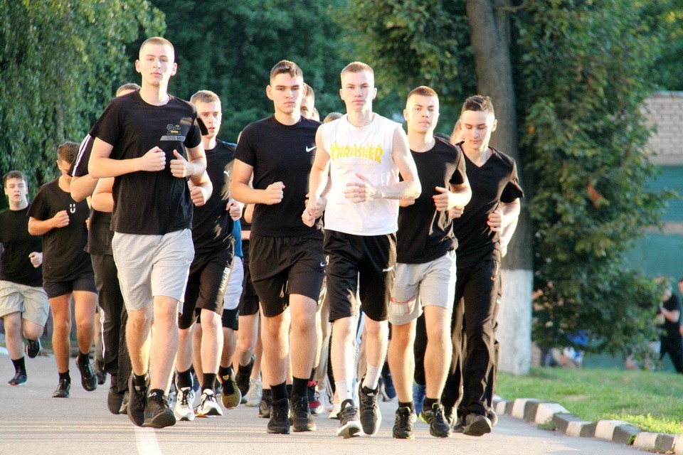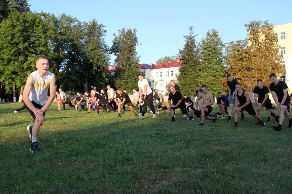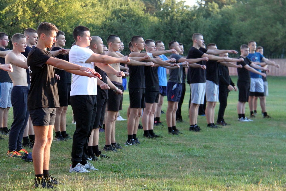 Одетые в физкультурную форму, воодушевленные новобранцы с готовностью выбегают в двор, будто нет другого занятия, чем на рассвете бежать 4 круга по стадиону и дружно приседать или отжиматься. Не отставая от парней, бегут и девушки.