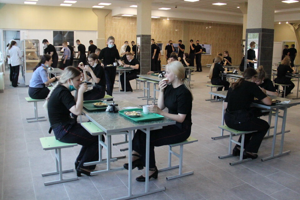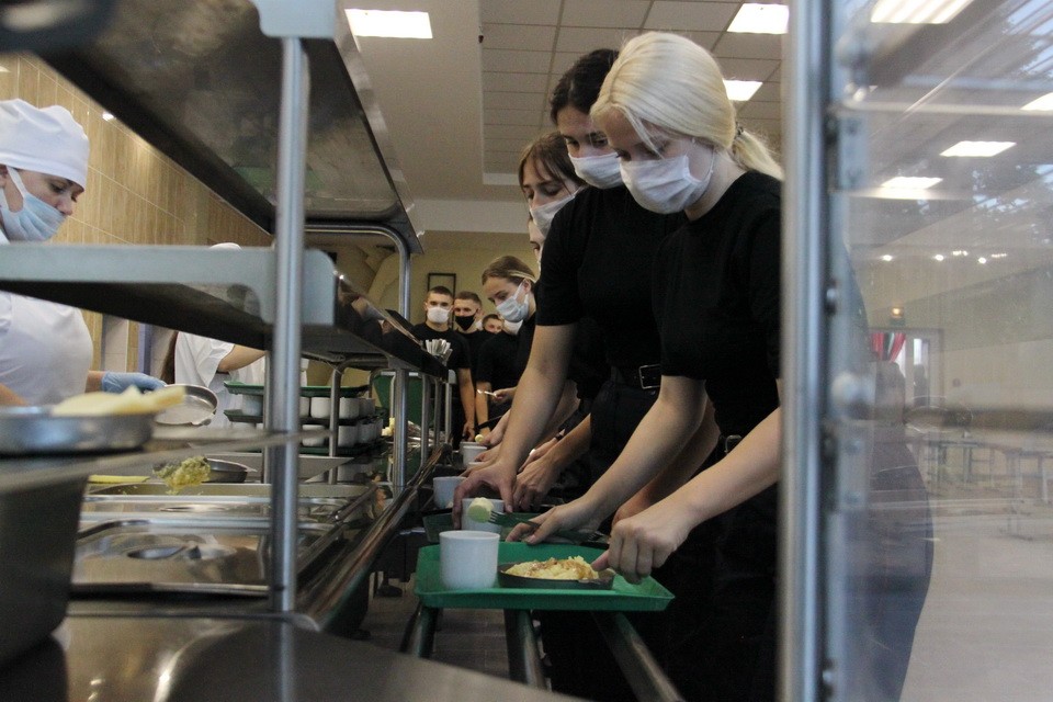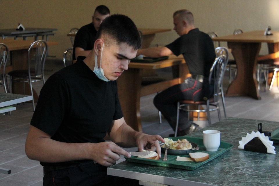 Пока ребята приводили себя в порядок, я, жертвуя маникюром, успела только застегнуть форменные брюки и поспешила в столовую – аромат пшенной каши с мясом точно привел к месту трапезы. Как сообщили повара, питание новобранцев и курсантов сбалансированное и сытное: в рационе ежедневно присутствуют каши, мясо, рыба, овощи, сливочное масло.