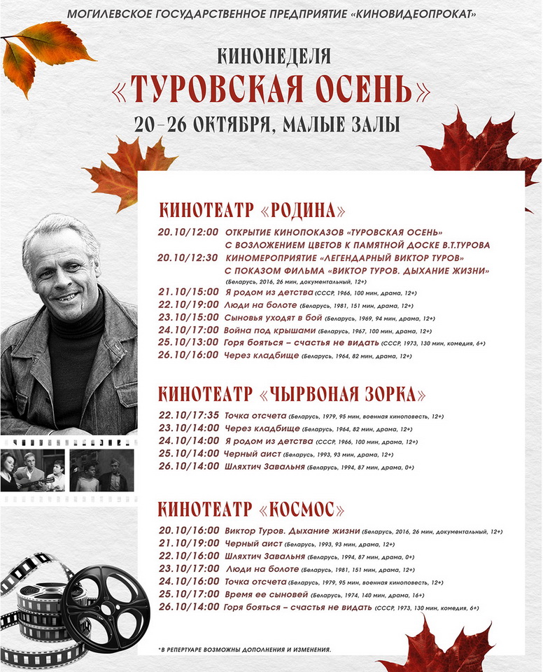 Кинонеделя «Туровская осень», посвященная памяти известного белорусского кинорежиссера и сценариста Виктора Турова, пройдет 20–26 октября в областном центре. Об этом сообщили в Могилевском государственном предприятии «Киновидеопрокат». Традиционную ежегодную ретроспективу можно увидеть в кинотеатрах «Родина», «Чырвоная Зорка» и «Космос».