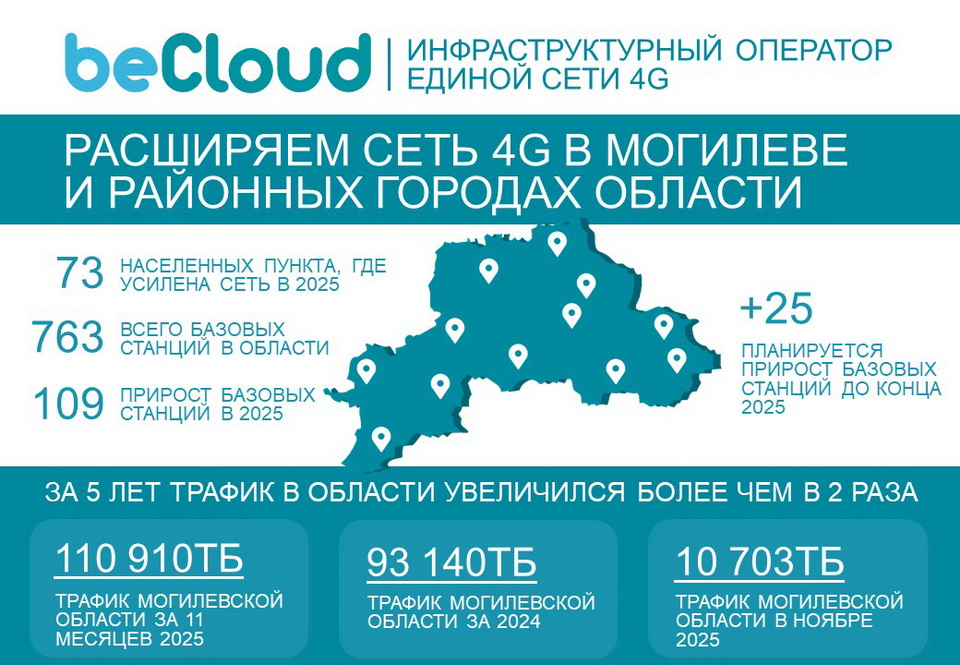 «Могилевская область является одним из самых «качающих» регионов страны — компания beCloud зафиксировала значительный рост потребления данных пользователями по отношению к 2021-му году, объем загружаемой информации увеличился более чем в два раза. Это говорит о том, насколько важно могилевчанам постоянно находится онлайн, иметь доступ к скоростному мобильному интернету в любой точке области. В ноябре 2025 года абоненты 4Gскачали на 22% больше данных по сравнению с ноябрем 2024 года, объем среднесуточного мобильного трафика также увеличился на 22%», — комментирует Юлия Гаврилович, заместитель генерального директора по коммерческим вопросам компании beCloud.