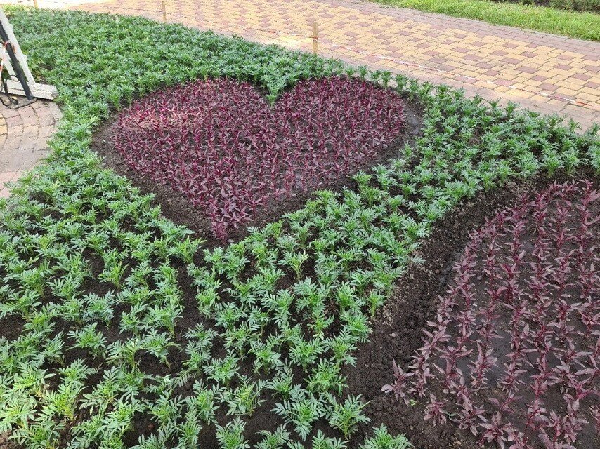 — Более 10 тысяч различных цветов ушло на создание этой композиции, — делится цветовод предприятия Инна Тетерюкова. – В центре из четырех тысяч иризинов расположилось слово «Каханне». Украшением клумбы стало шесть больших сердец. Только на создание одного сердца ушло еще порядка 700 штук этих цветов. Шесть тысяч цветов цинерария и тагетеса или в простонародье бархатцы будут подчеркивать цветочную композицию.