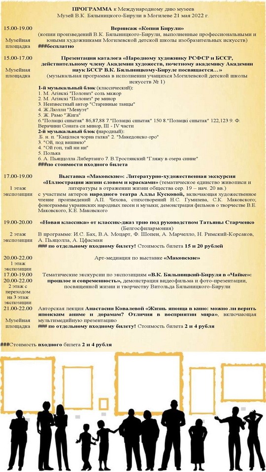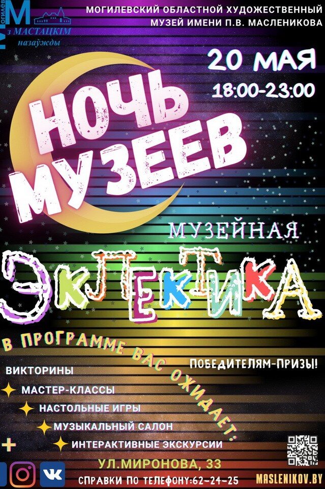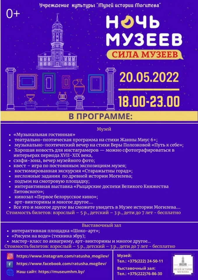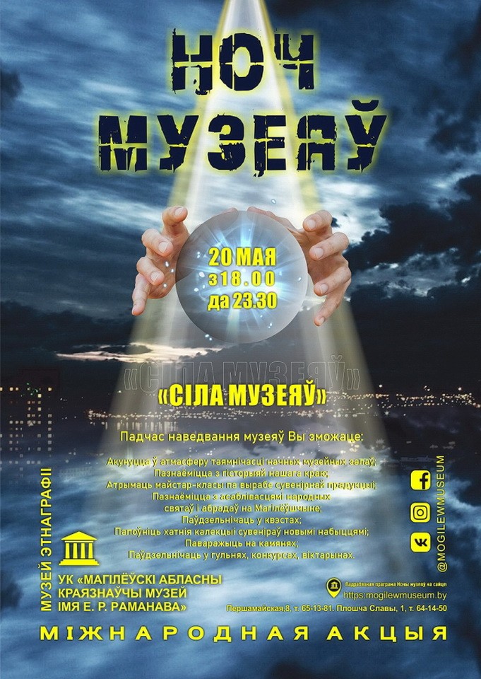 Могилевский областной художественный музей им. П.В. Масленикова, музей истории Могилева, Могилевский областной краеведческий музей и Музей этнографии приглашают посетить их экспозиции вечером в пятницу — 20 мая. Музей В.К. Бялынцкого-Бирули устроит необычную акцию в субботу — 21 мая.