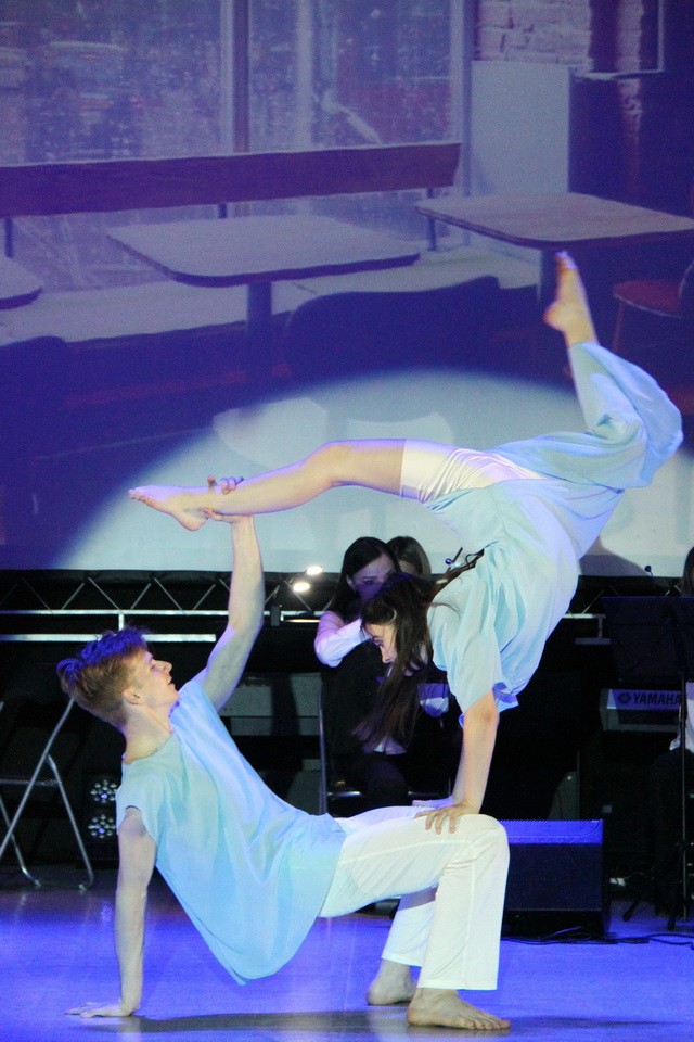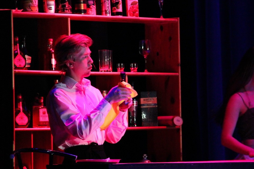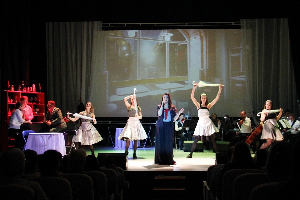 В кафе за его спиной разворачиваются различные жизненные истории любви и ревности, успеха и неудач, которые разыгрывали талантливые артисты филармонии Ольга Горничар, Наталья Красикова, Надежда Лейченко, Анна Голубева, Павел Любченко, Алекша Черный, Валерия Азаренко под аккомпанемент струнного квартета «Gold String Quartet».