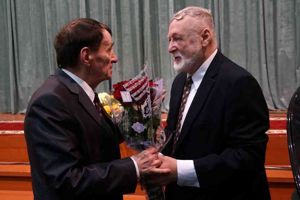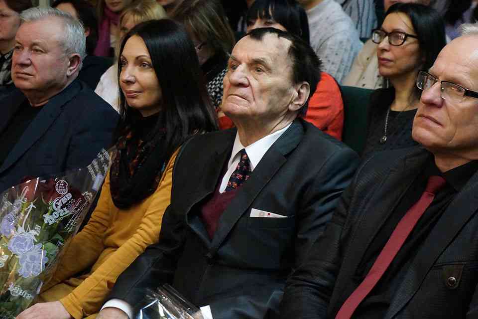 Звучали на «бис» премьерные песни юбиляра, исполнялись одаренными детьми фортепианные пьесы, произносились стихи и приветственные адреса. Однако когда к сцене медленно и осторожно начал подходить Народный артист СССР, композитор Игорь Лученок (сказывается преклонный возраст), зал встал и долго-долго аплодировал. Два мэтра слились в дружеских объятиях. Звучали слова поздравлений, пожелания здоровья и творчества. И вот Игорь Лученок подошел к роялю и зазвучала песня, которую подпевал юбиляр и весь зал…