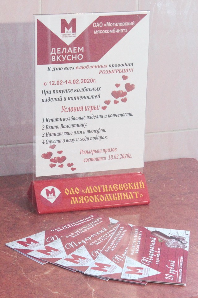 Сегодня в фирменном магазине Могилевского мясокомбината подвели итоги розыгрыша, приуроченного ко Дню Святого Валентина. Победители получили сертификаты на 20 рублей на следующую покупку.
