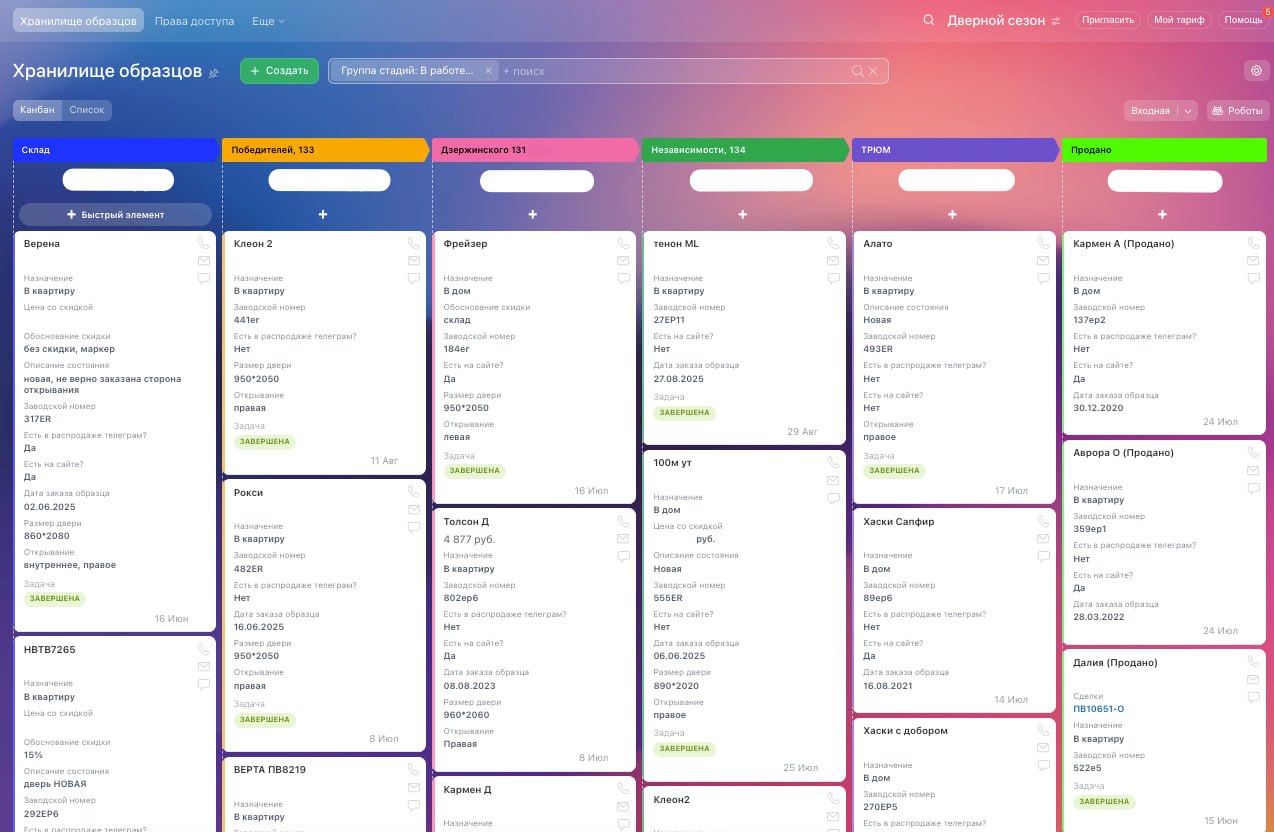 Для клиентов ООО «Дверной сезон» ничего не изменилось — они по-прежнему приходили в салоны, получали консультацию и ждали свои двери. Все перемены происходили внутри команды. В систему начали поступать заявки из разных источников (звонки с телефонии, формы с сайта, обращения из рекламы и даже сообщения из соцсетей). Все они теперь сразу фиксировались в CRM и не терялись, а вместе с этим сохранялись договорённости и история общения. Менеджеры получали напоминания о звонках и статусах заказов, а руководители видели: если правильно работать в системе, она экономит время, снимает рутину и повышает качество обслуживания.