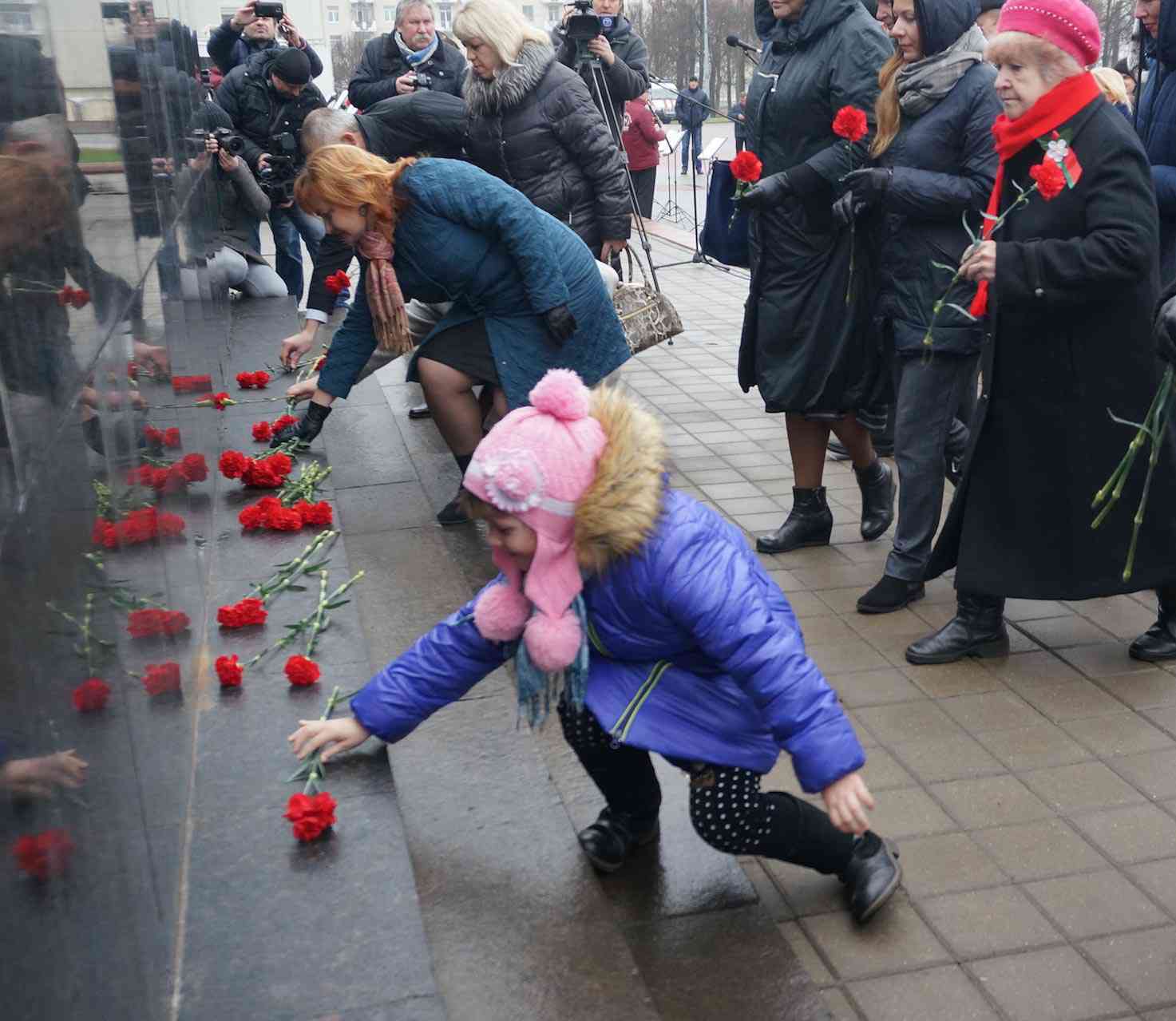 Могилевчане с красными ленточками и транспарантами возложили цветы к подножию памятника вождя революции.
