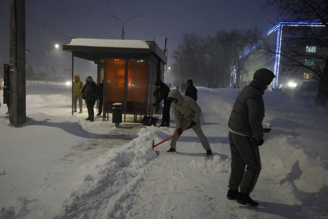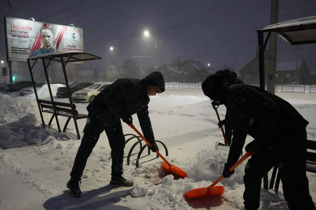 Курсанты и офицеры Могилёвского института МВД очищают от снега территорию возле института, пешеходные дорожки, ведущие к многоэтажным домам, подходы к пешеходным переходам, а также ближайшие остановки общественного транспорта.