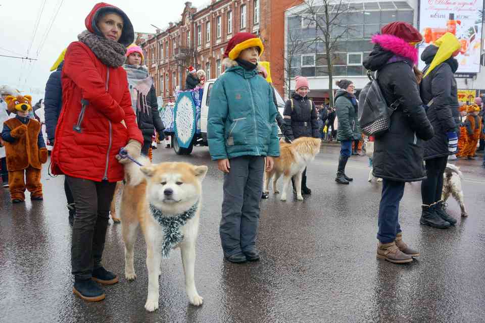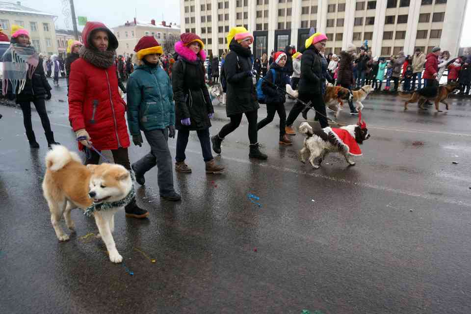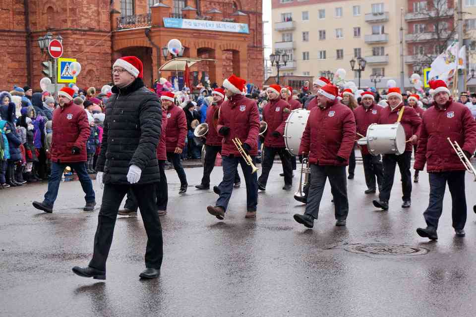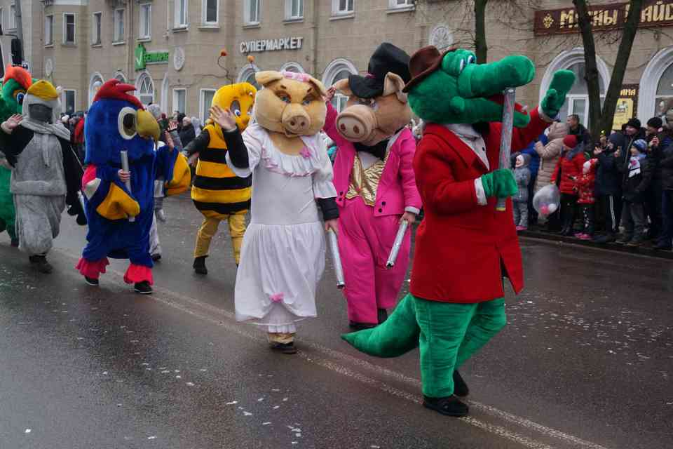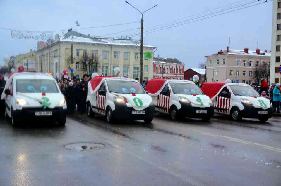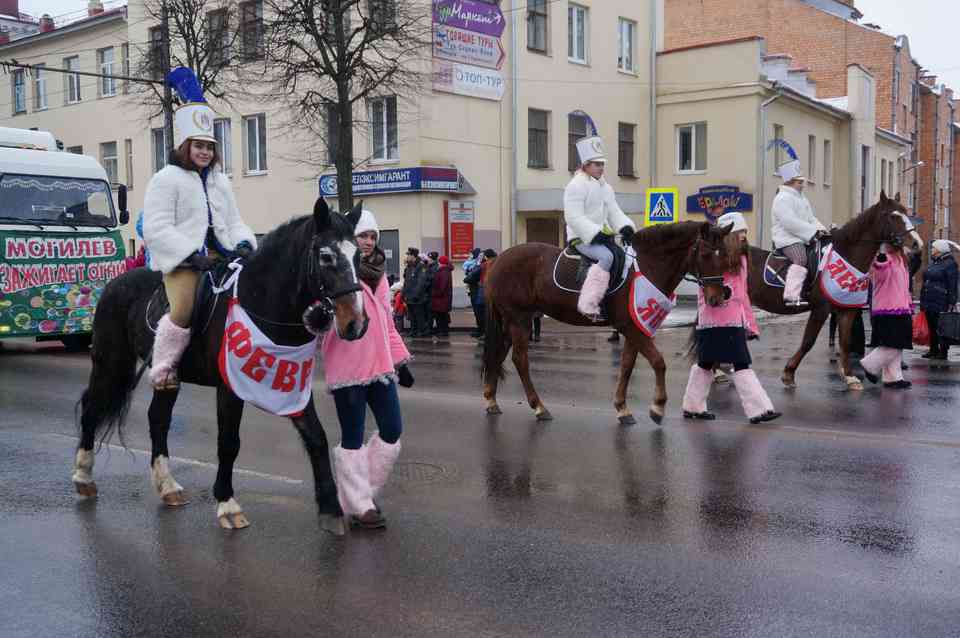 Праздничная колонна проследовала от площади Славы по улице Первомайской, Миронова, Ленинской до площади Звезд. В шествии приняли участие сотни Дедов Морозов и Снегурочек в шикарных костюмах, сказочные и мультяшные персонажи, Снеговики, а также музыканты и собаководы со своими любимцами – символами наступающего года. Громкими хлопушками и яркими бенгальскими огнями порадовали гостей пожарные, а все шествие двигалось под звуки шагавшего во главе колонны Могилевского городского оркестра под управлением Александра Городкова.