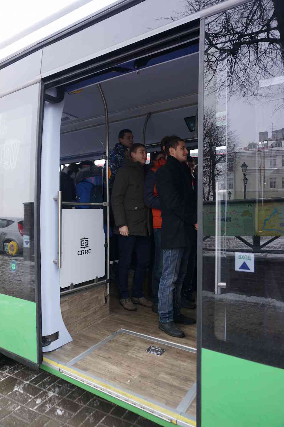 В электробусе не открываются окна — функции регулирования температуры воздуха в салоне выполняет кондиционер. Салон рассчитан на 22 сидячих места, стоя могут ехать максимум 58 человек.