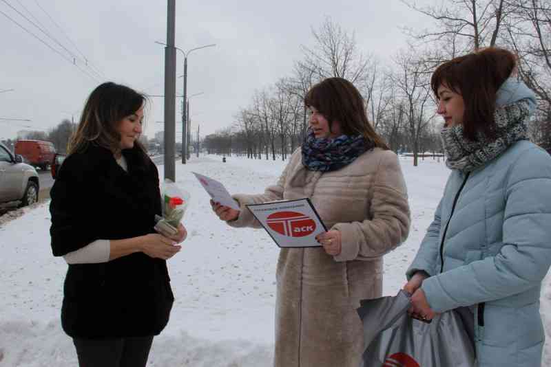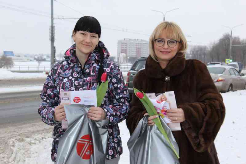 Каждый день до 8-го числа поздравительный экипаж ГАИ поздравлял женщин за рулем и вручал им тюльпаны и скидочные сертификаты магазина автозапчастей «Авто1».