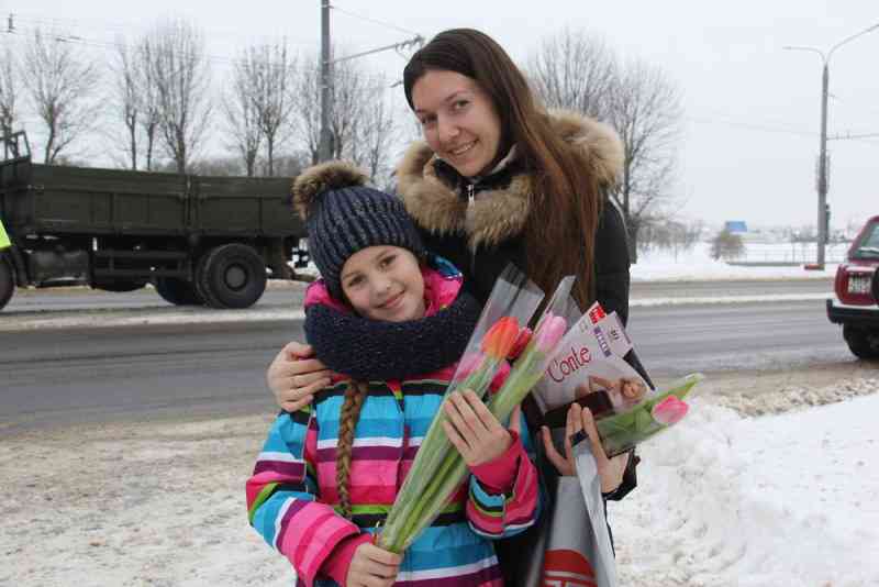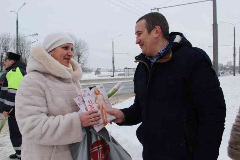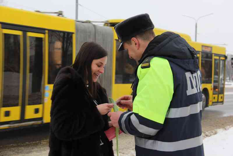 А накануне праздника, 7 марта, в город выдвинулись целых три экипажа ГАИ. На центральных улицах инспекторы не штрафовали за нарушения правил, а вместе с партнерами мероприятия поздравляли женщин-водителей и вручали им цветы от КПУП «Могилевзеленстрой», сувениры и подарки от страховой компании «Таск» и СООО «Конте Трейд».