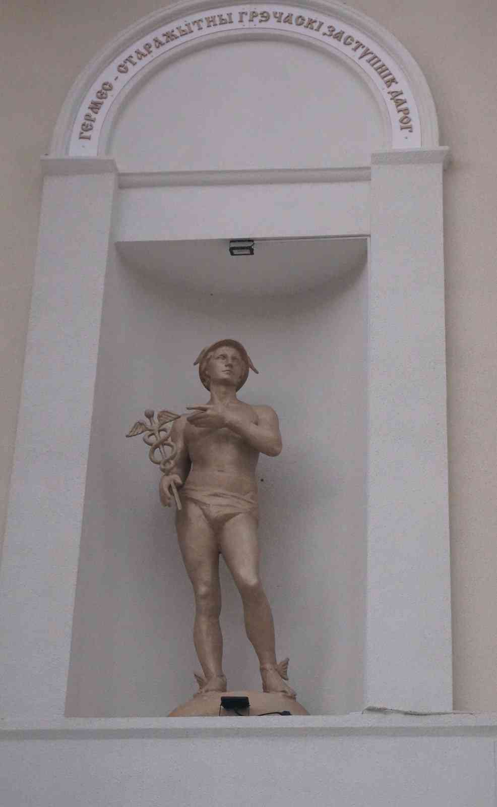 Сегодня в областном центре торжественно открыли скульптурную композицию «покровителей дорог». Скульптуры греческого бога Гермеса и славянского бога Велеса высотой 2,4 метра украсили ниши административного здания РУП «Могилевавтодор».