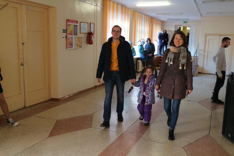 На участке для голосования №32 основной наплыв голосующих зафиксировали примерно с 9 утра. Люди идут семьями. На их лицах улыбки.