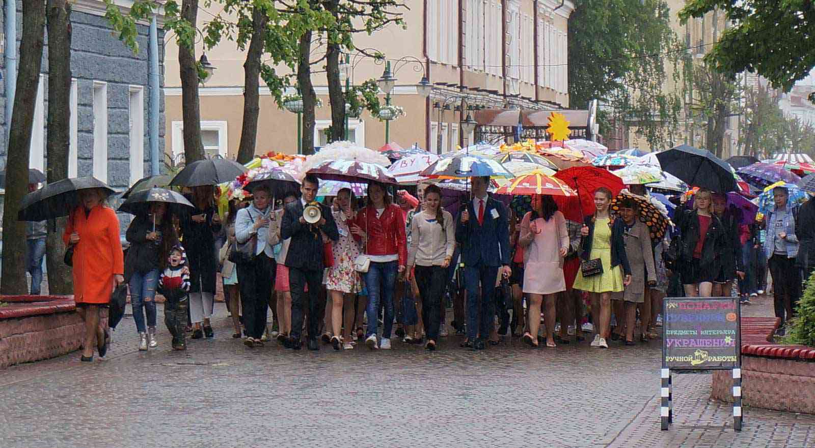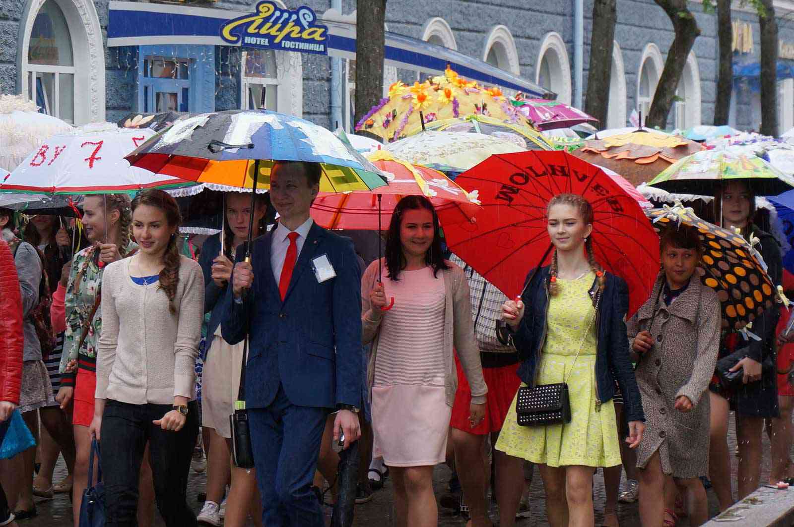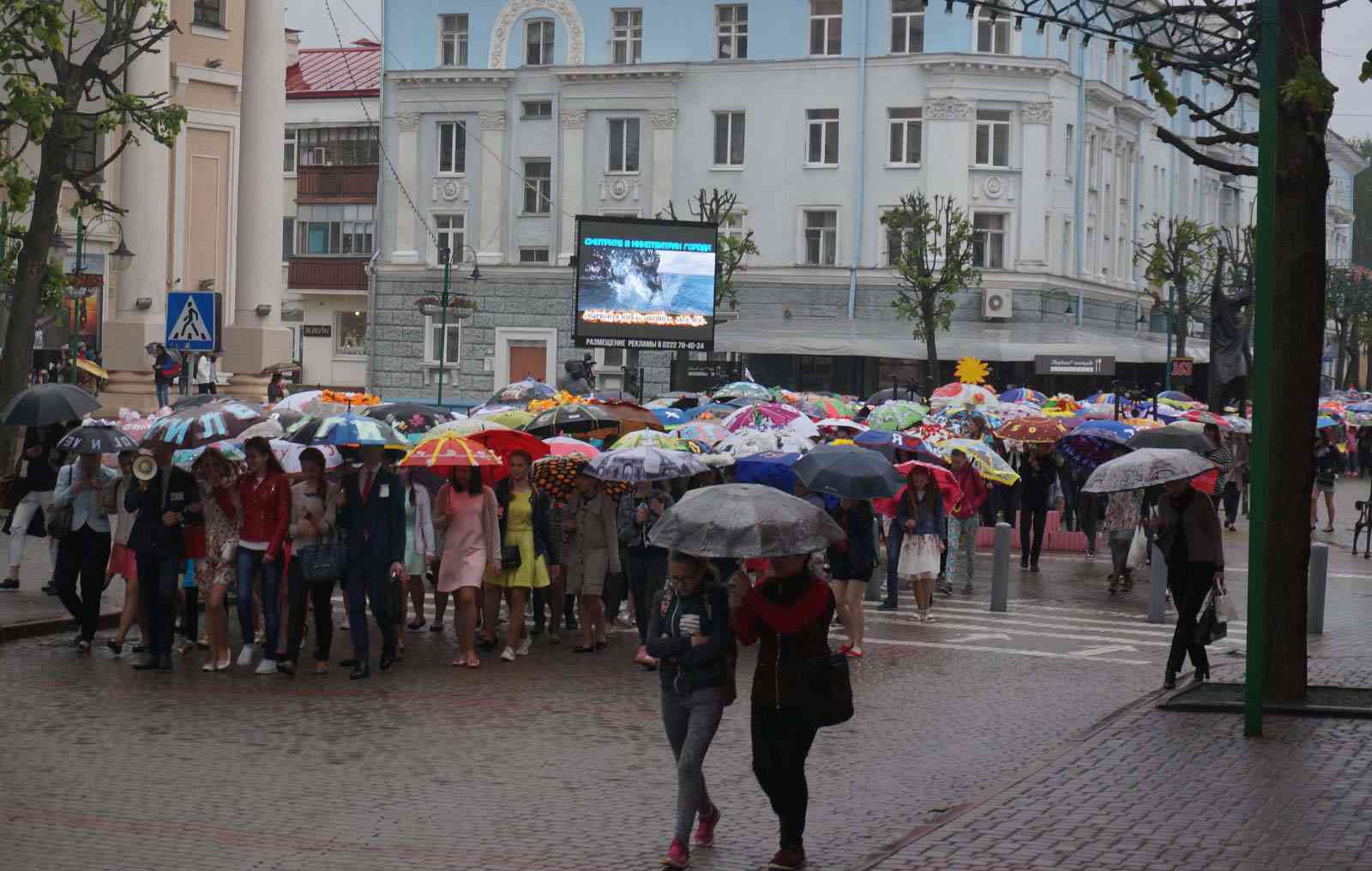 Сегодня в Могилеве во второй раз прошел парад зонтов, приуроченный ко Дню защиты детей. Столь красочное мероприятие не омрачил даже проливной дождь. Около тысячи школьников со всего города прошли по улице Ленинской до сквера 40-летия Победы, где гостей праздника ждала увлекательная музыкальная и конкурсная программа.
