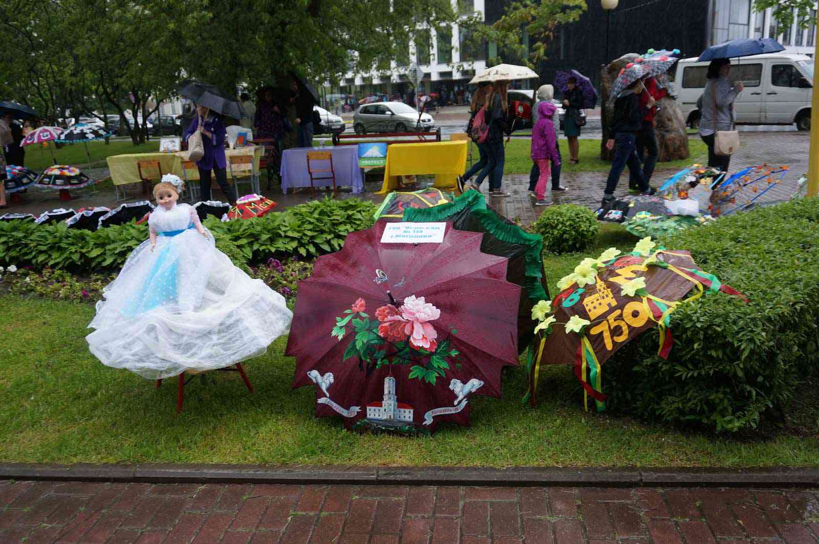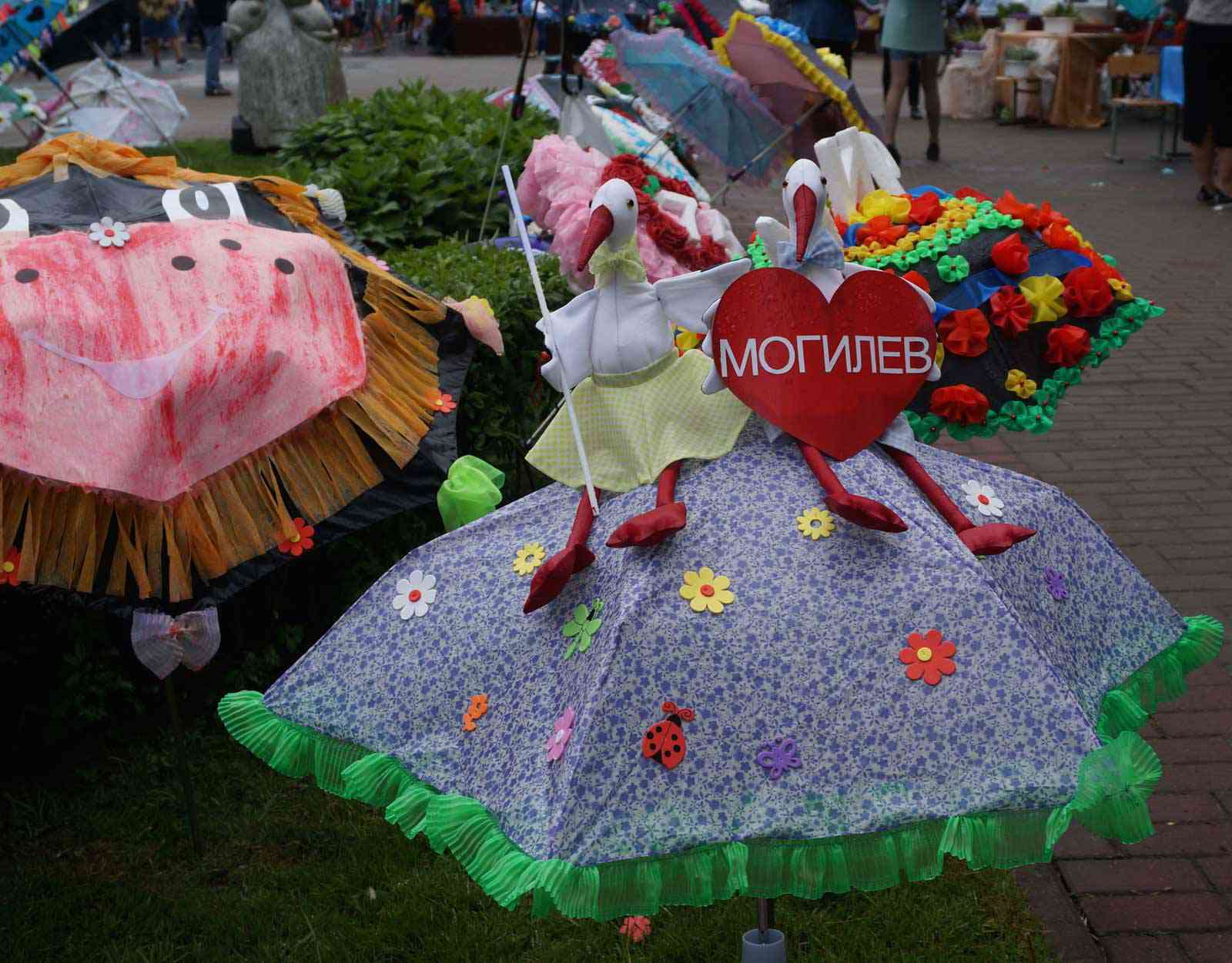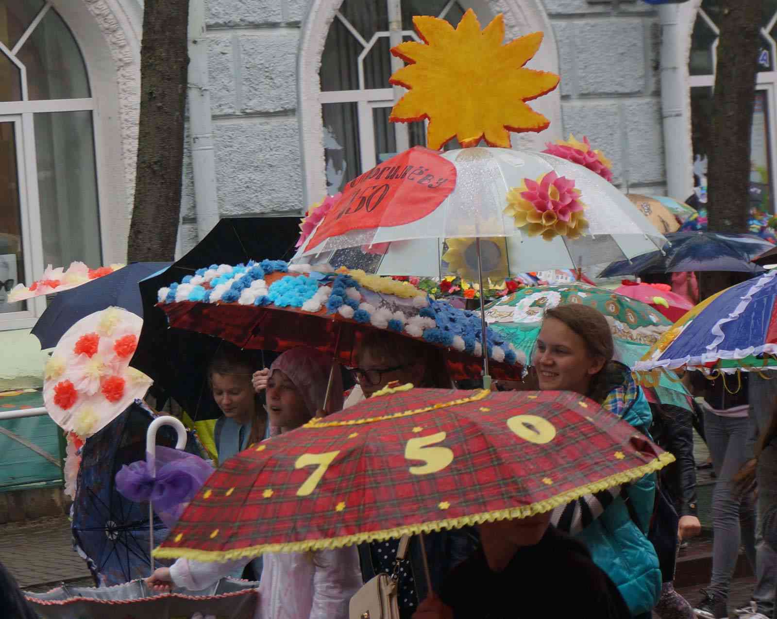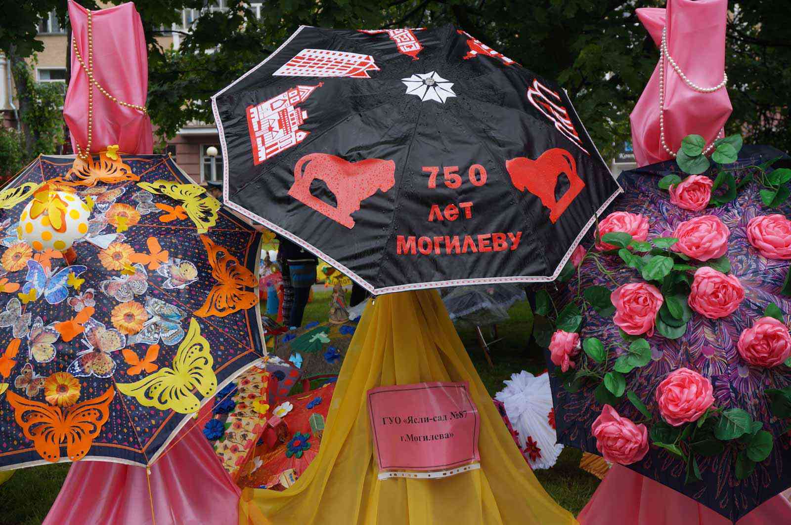Зонты участников удивляли своей неординарностью: национальные символы, юбилейные к 750-летию Могилева, цветочные композиции, мультяшные герои и многое другое. К сожалению, ливень и ветер значительно подпортили некоторые работы, а зонтам во время парада «пришлось» выполнять свою первостепенную задачу – защищать ребятню от ливня и ветра. Но всё же, было весело и красиво.