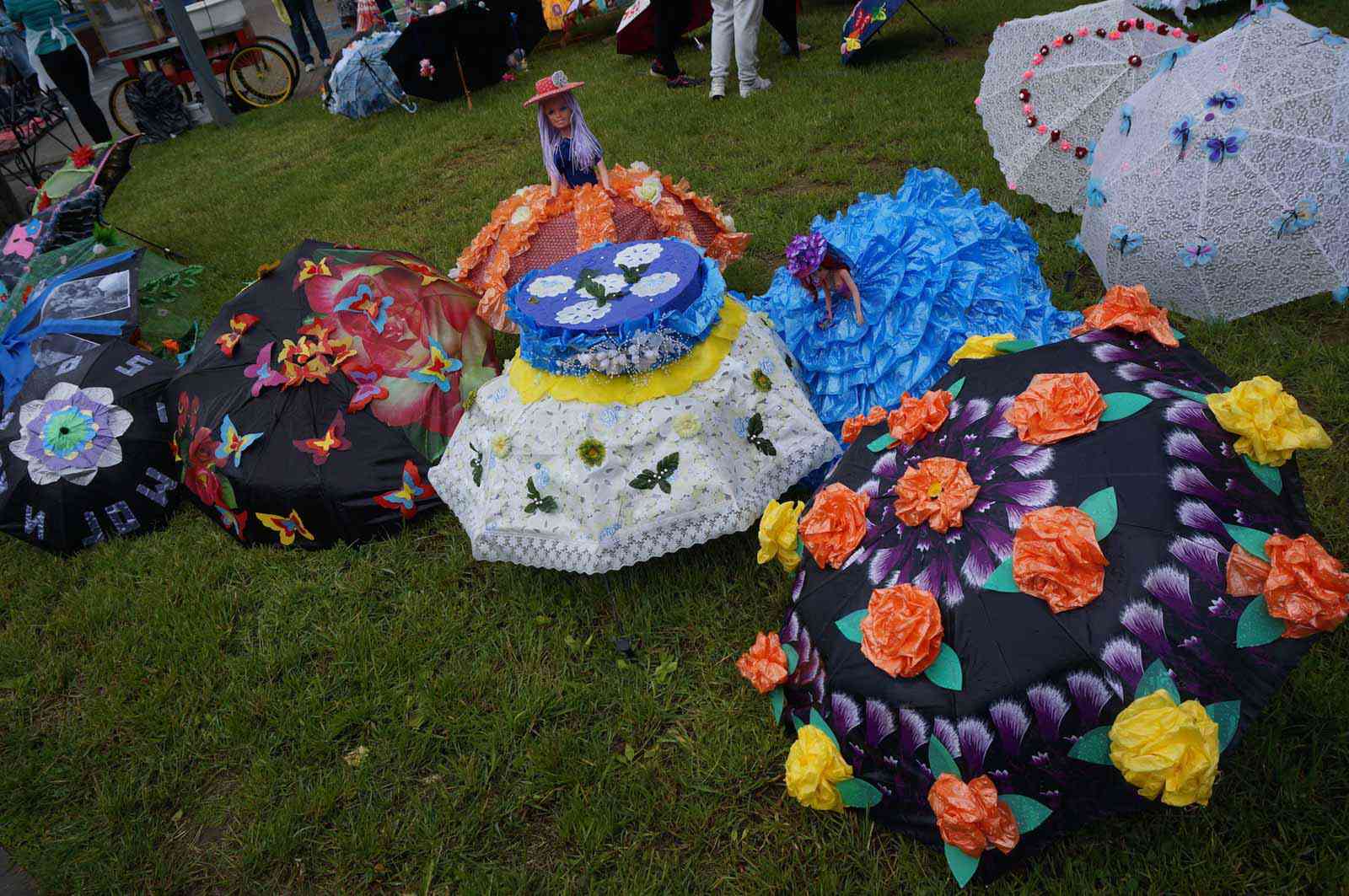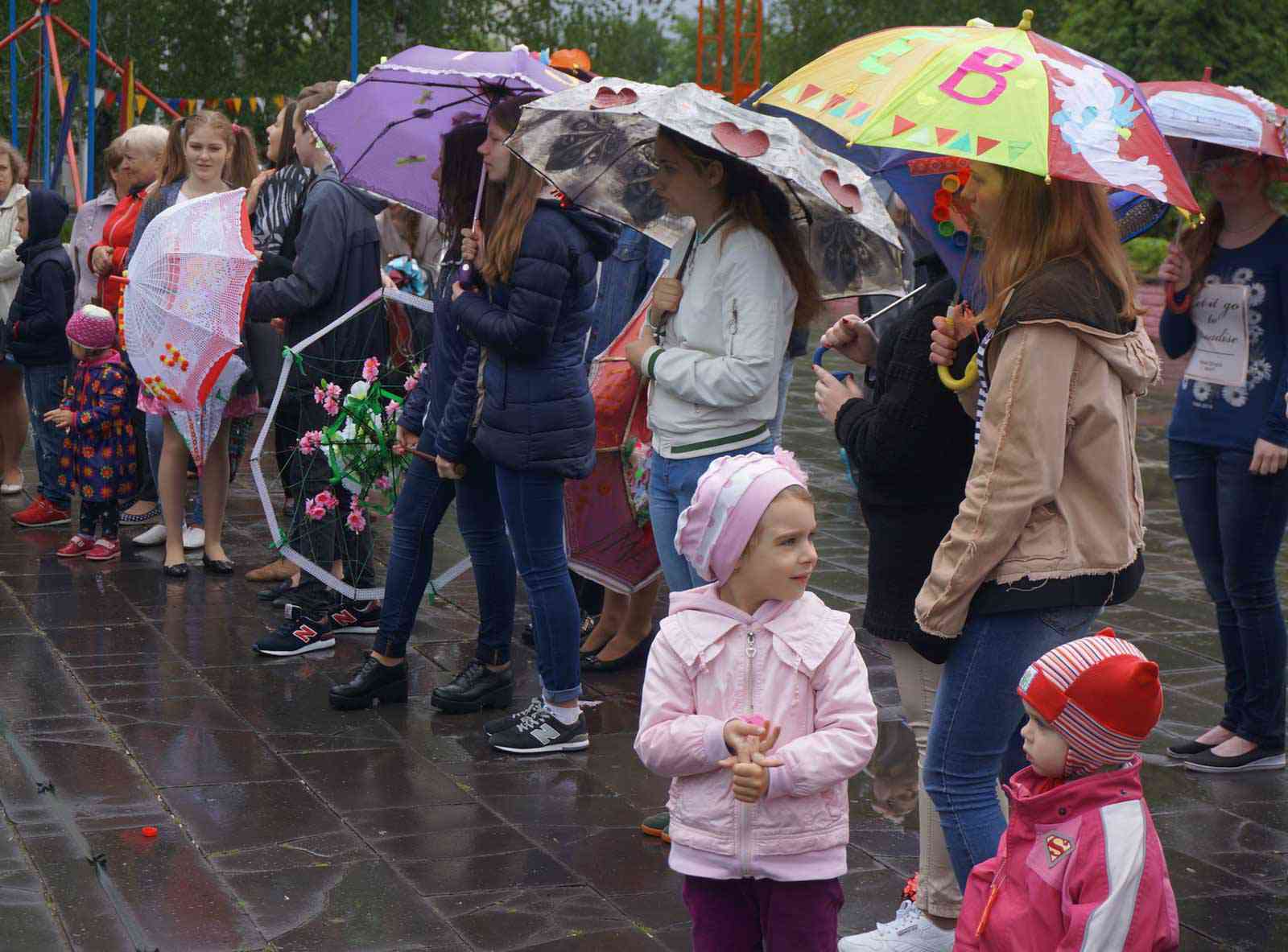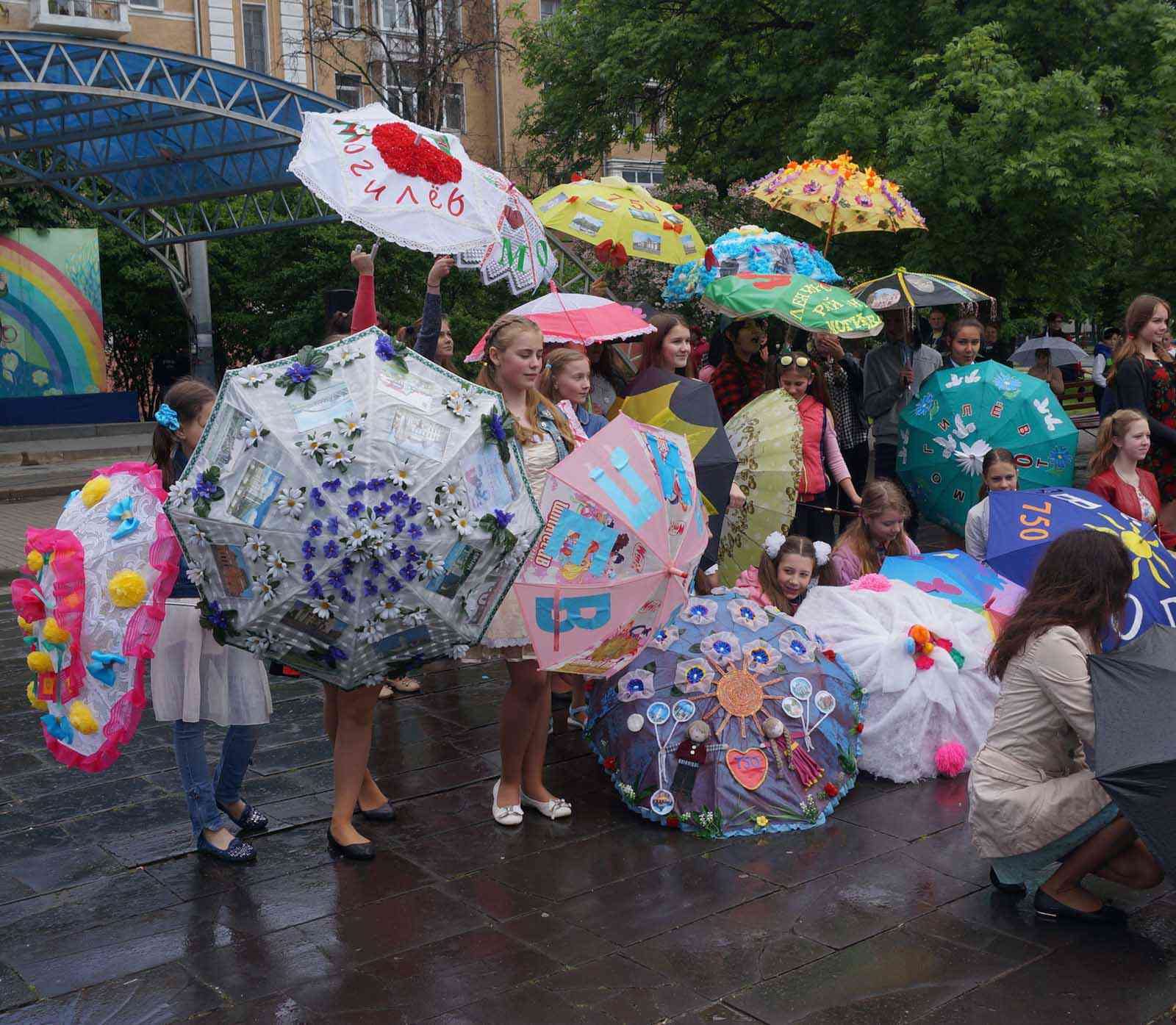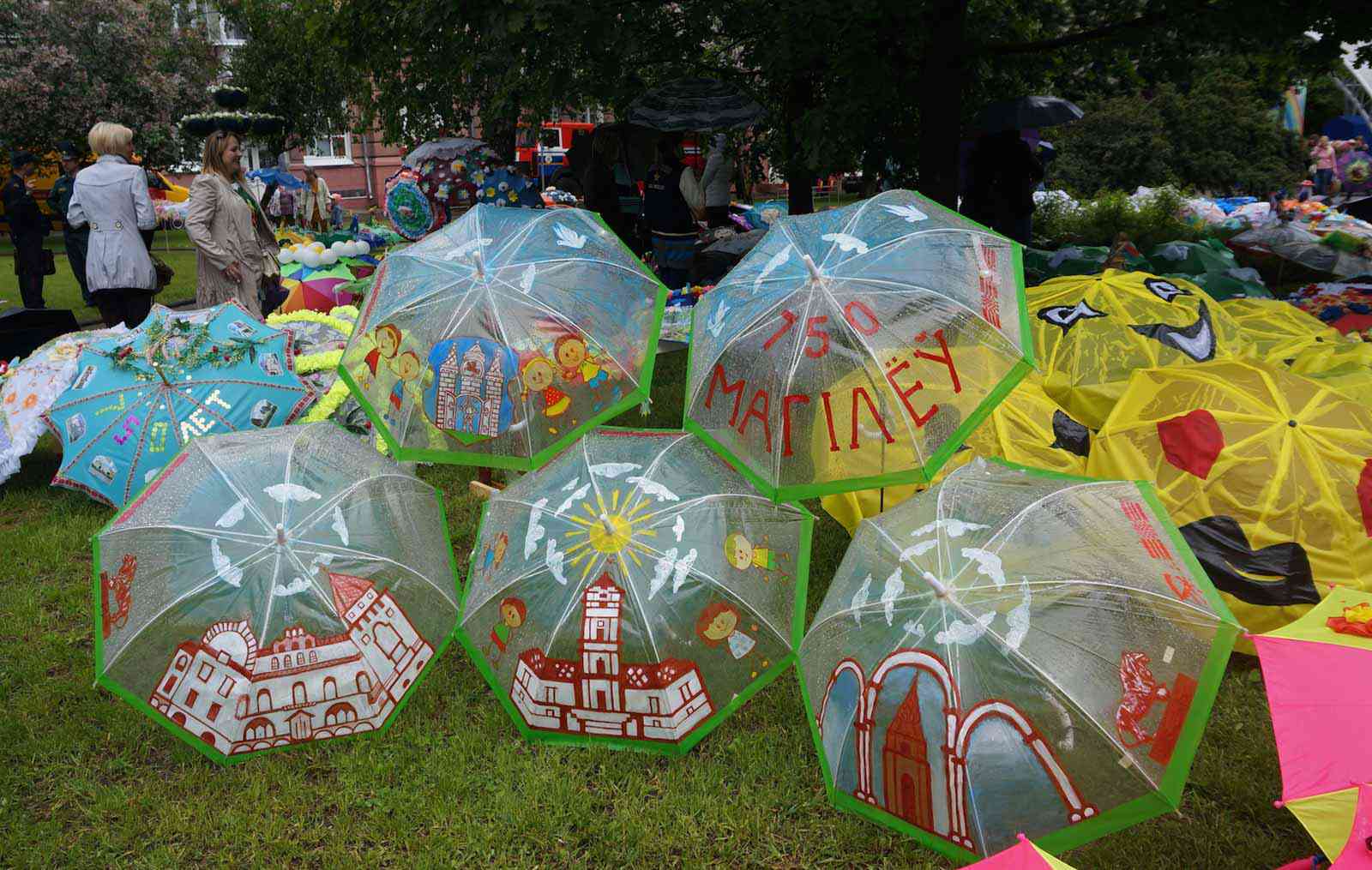 Зонты участников удивляли своей неординарностью: национальные символы, юбилейные к 750-летию Могилева, цветочные композиции, мультяшные герои и многое другое. К сожалению, ливень и ветер значительно подпортили некоторые работы, а зонтам во время парада «пришлось» выполнять свою первостепенную задачу – защищать ребятню от ливня и ветра. Но всё же, было весело и красиво.