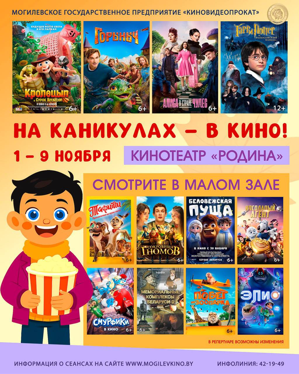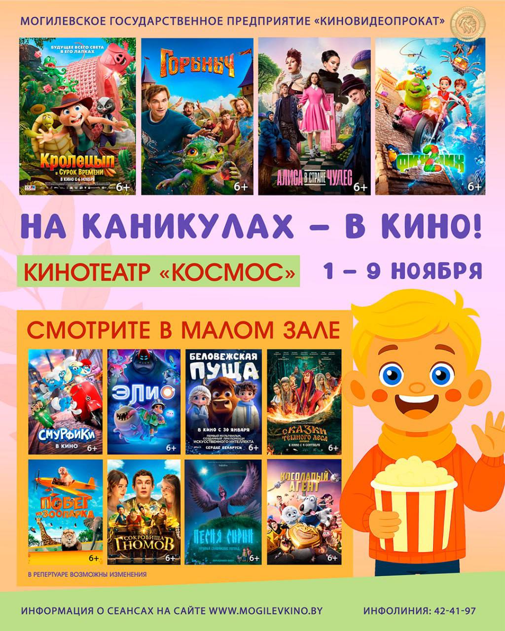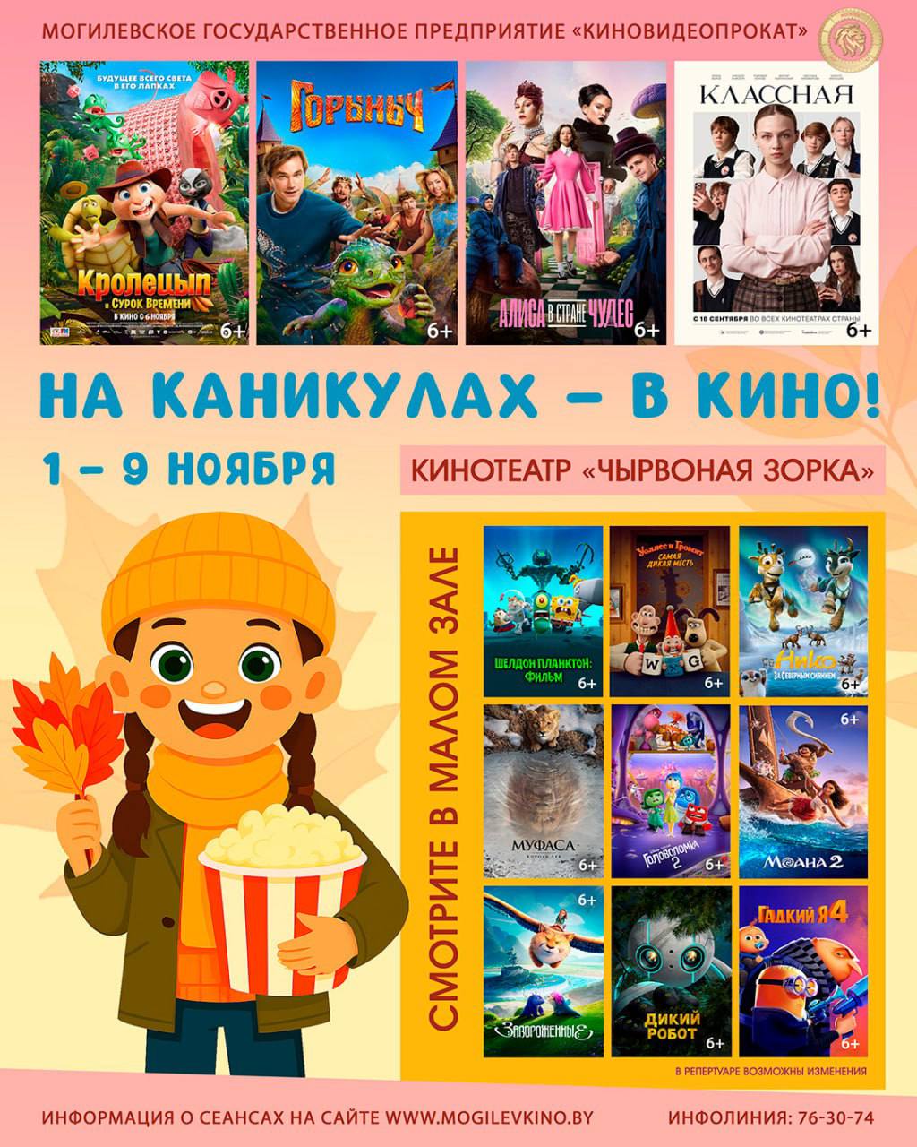 С 1 по 9 ноября приглашаем вас в кинотеатры РОДИНА, КОСМОС и ЧЫРВОНАЯ ЗОРКА, где вас ждут самые свежие премьеры, захватывающие приключения и море попкорна!