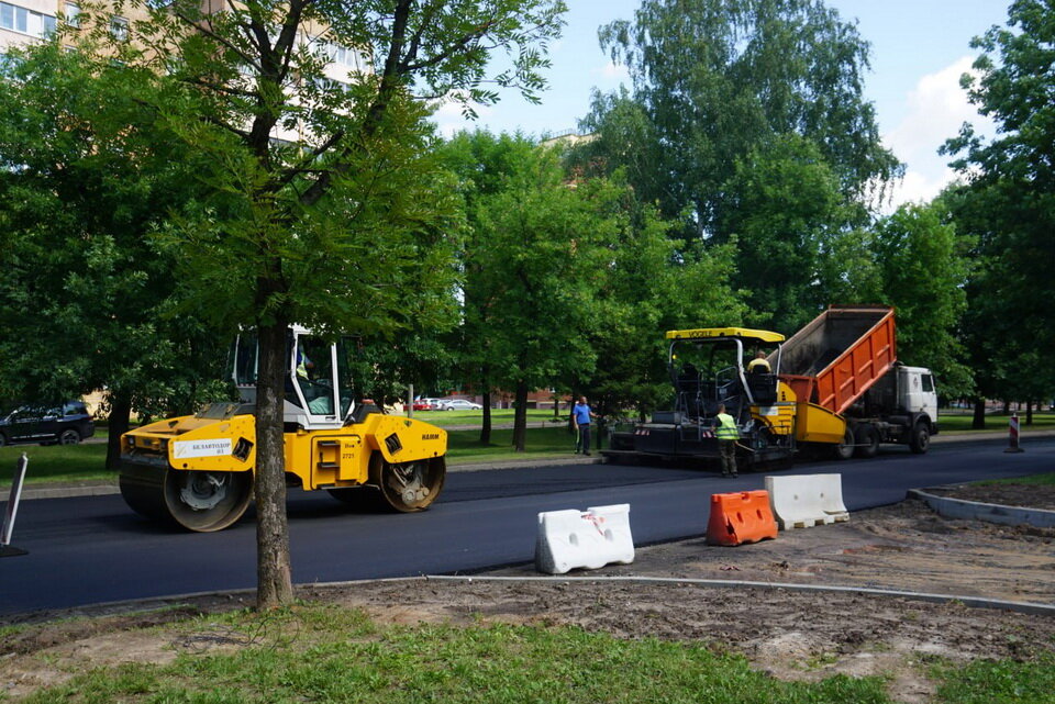 Здесь сняли старое дорожное полотно и укладывают новое асфальтобетонное покрытие. Ремонт касается только проезжей части. Как отметил первый заместитель генерального директора ОАО «Дорожно-строительный трест № 3 Александр Абламейко, «переодевание» части Гришина планируется завершить уже в эти выходные.