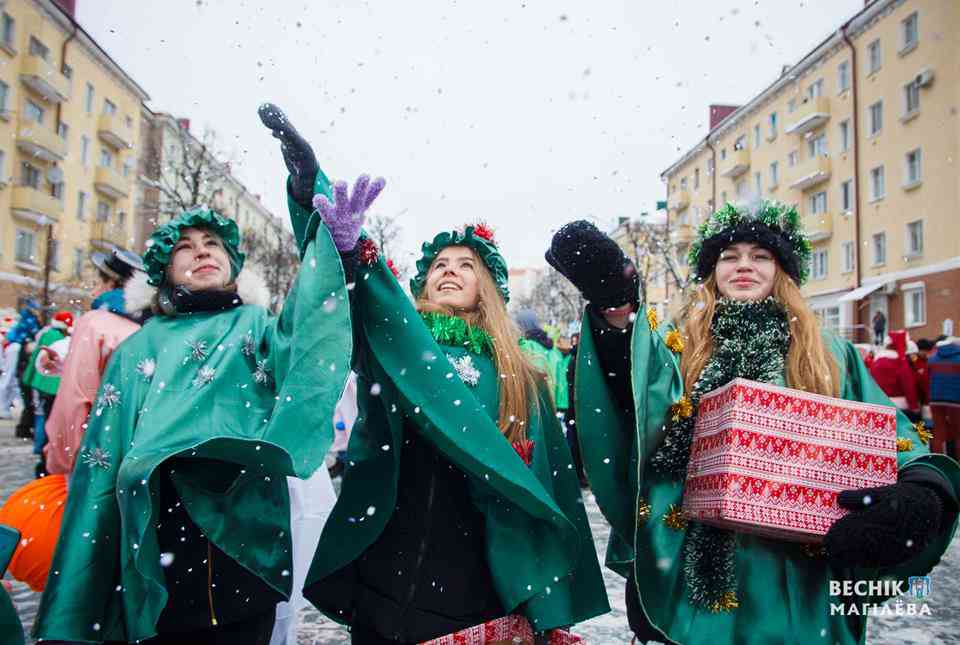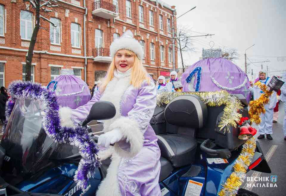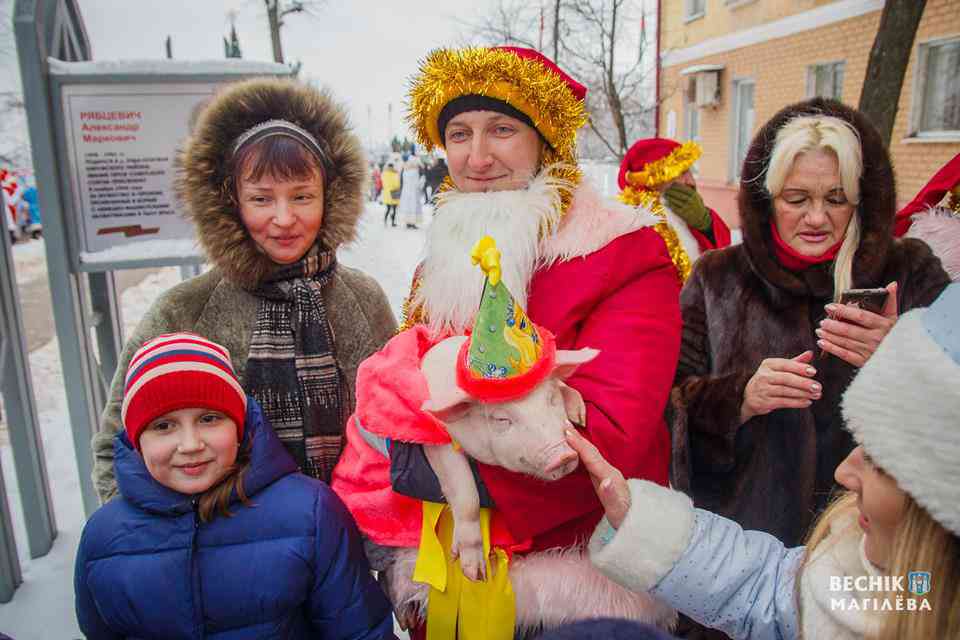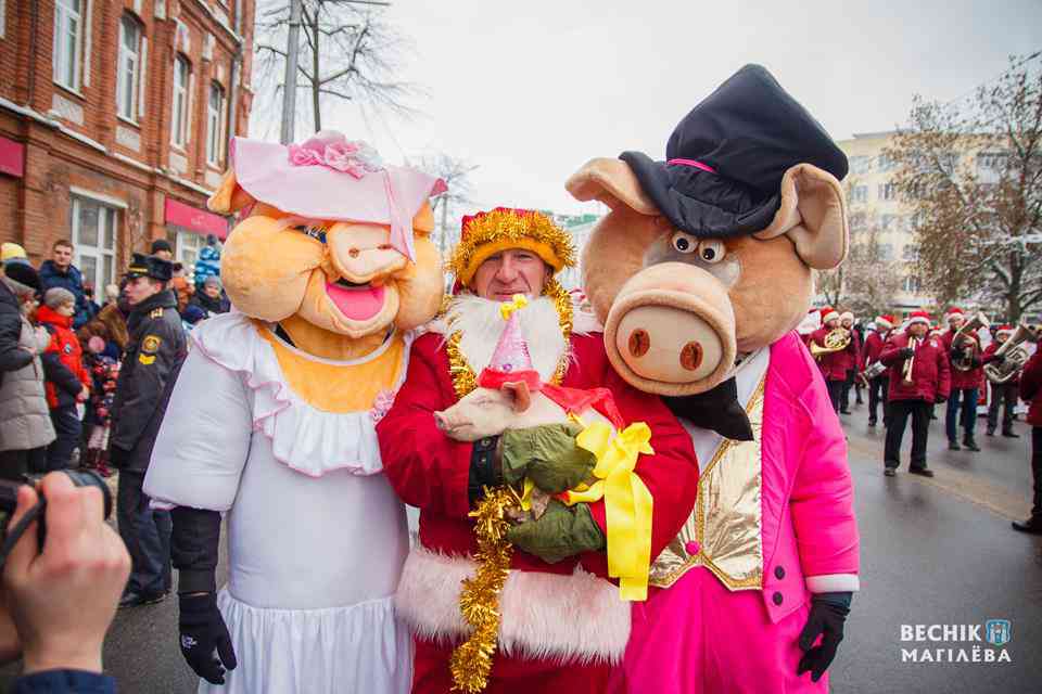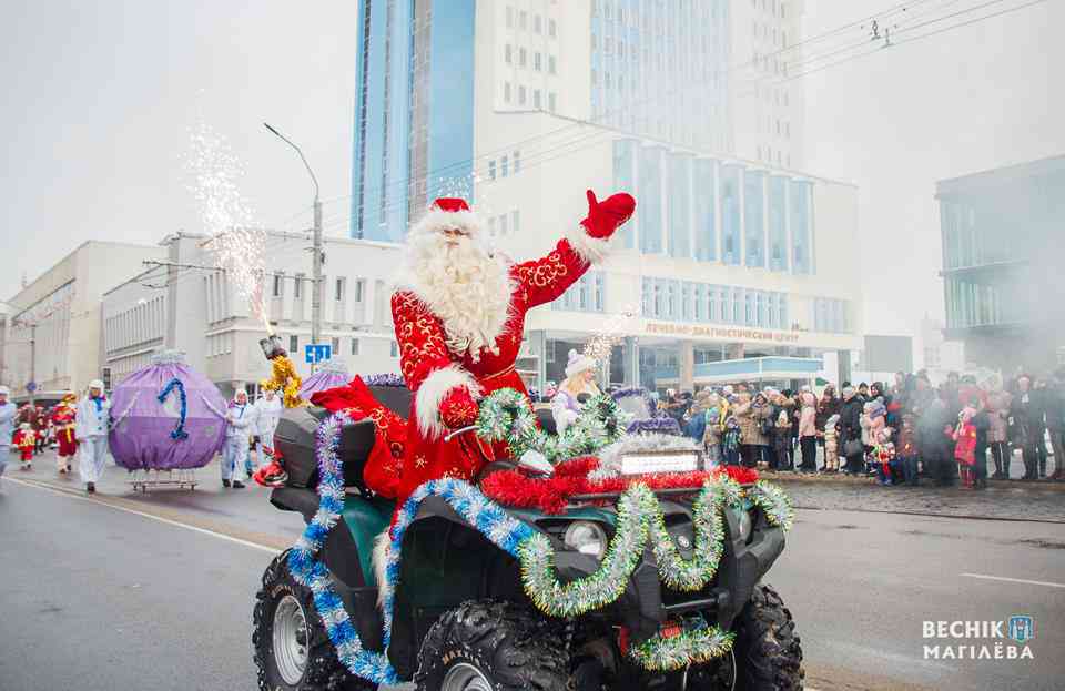 Большое шествие Дедов Морозов в Могилеве стало хорошей предновогодней традицией. Сегодня от улицы Миронова по Первомайской и до площади Славы прошлись около пяти сотен Дедов Морозов, Снегурочек и других сказочных персонажей. Половину из них представляли предприятия и учебные заведения города. Главный Дед Мороз и две Снегурочки открывали парад, двигаясь на квадроциклах. Вслед за ними — символы будущего года — живые поросята.