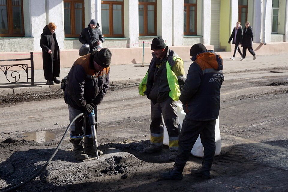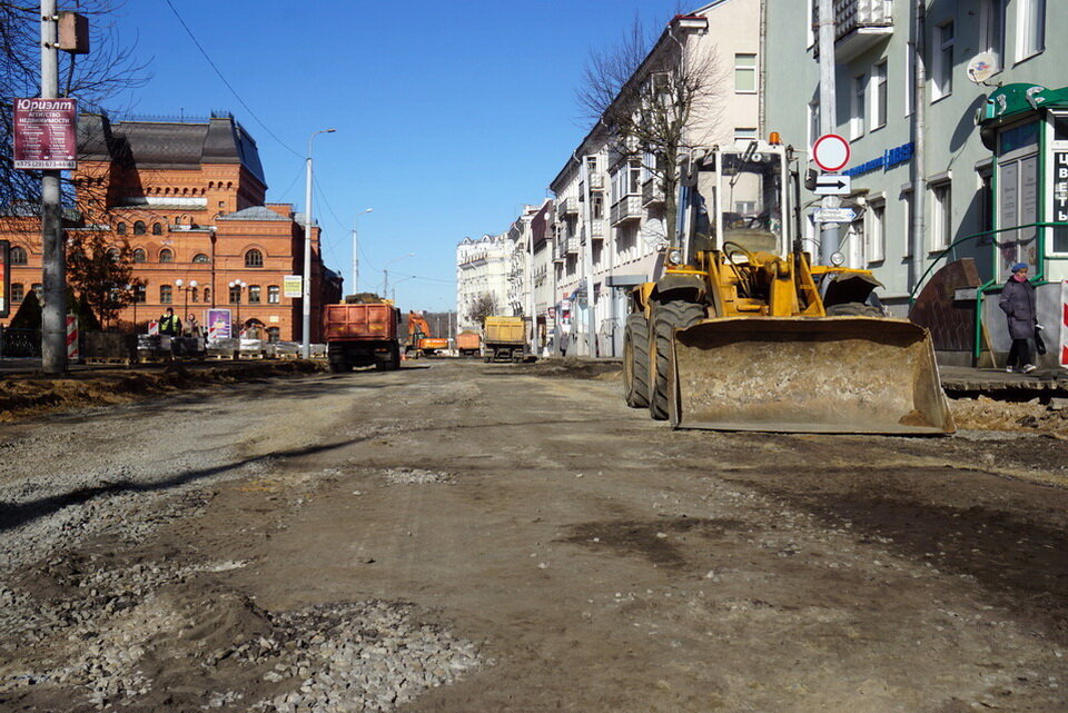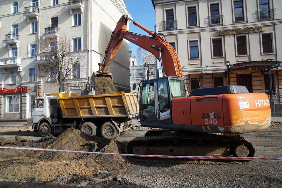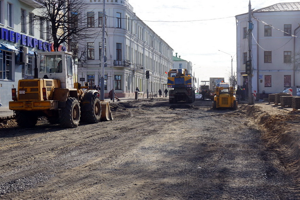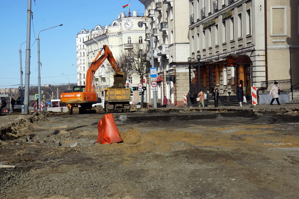 Работы на Комсомольской идут полным ходом. Уже сняли асфальтовое покрытие. Сейчас убирают старое основание. Как рассказал первый заместитель генерального директора ОАО «ДСТ №3» Александр Абламейко, его полностью уберут на участке от улицы Первомайской до Ленинской, включая перекресток Комсомольская-Ленинская, на глубине более 1,4 м. Вместо него появится многослойная «подушка» под дорожное полотно.