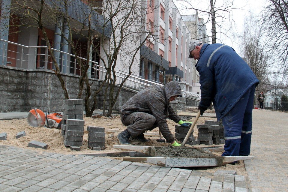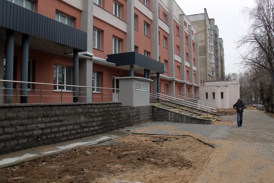 Сегодня на улице ведутся завершающие работы по благоустройству территории: укладываются широкие пешеходные дорожки, на крыльце установлены современные перила, монтируется электрический подъемник для физически ослабленных людей.