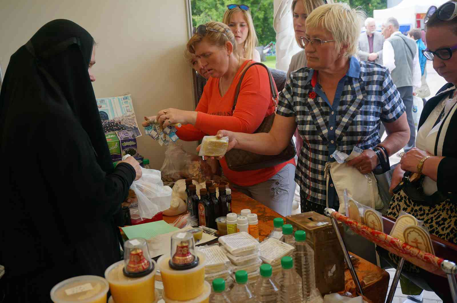 На ярмарке также представлены товары здорового питания: кедровые бальзамы, живица кедра, натуральные пищевые растительные масла, орехи и сухофрукты. Также можно приобрести мед и продукты пчеловодства, освященные травяные сборы и фиточаи.