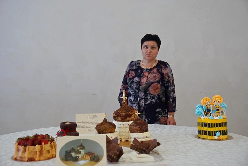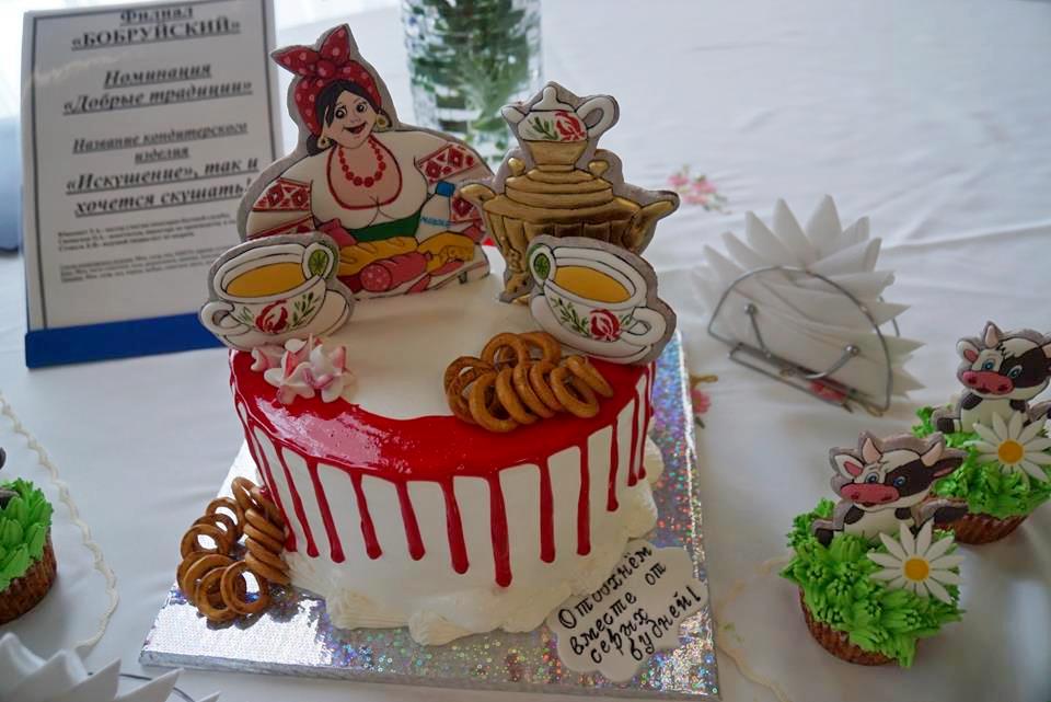 — Эта композиция посвящена месту, на котором расположен наш завод. Раньше здесь находился Тупичевский монастырь, основанный в 1641 году. Осталось лишь несколько башен. Вот, глядя на них, испекли тортики. Одни – по советским рецептам, другие – по современным, — представила композицию начальник отдела учета и отчетности филиала «Мстиславский» ОАО «Бабушкина крынка» Ирина Снытко.