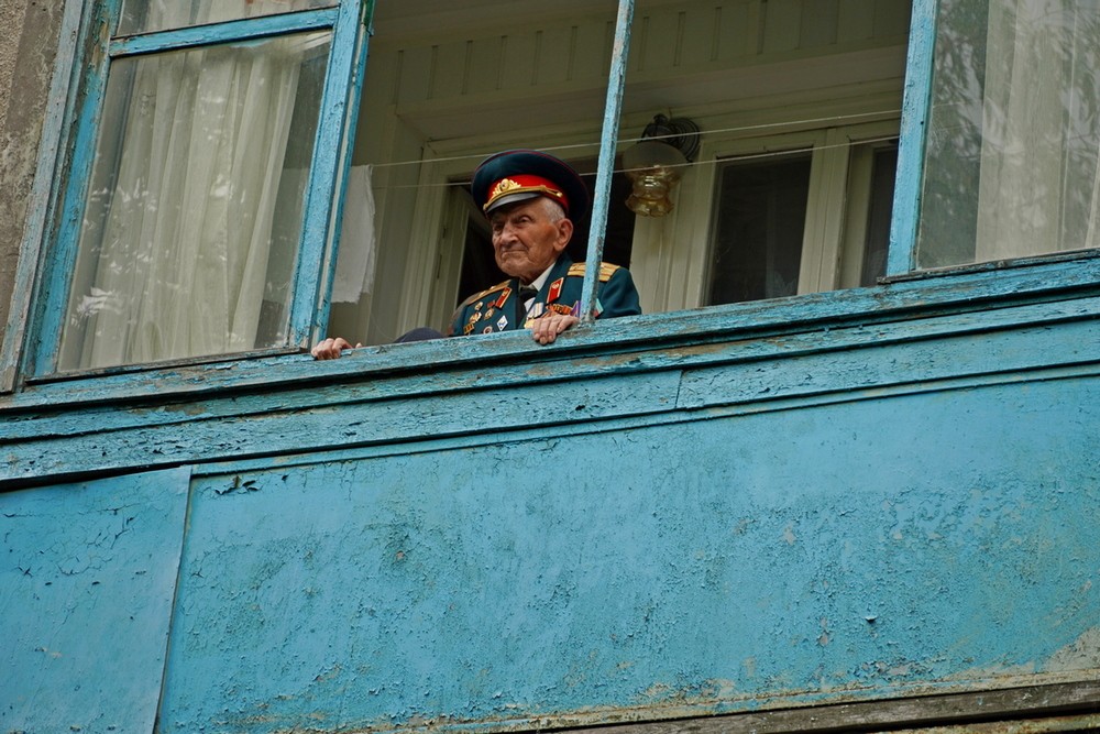 Стоя на балконе в праздничном кителе с орденами и медалями, ветеран со слезами на глазах принимал поздравления от Могилевского городского совета ветеранов, Ленинской районной организации ветеранов и учащихся СШ№40.