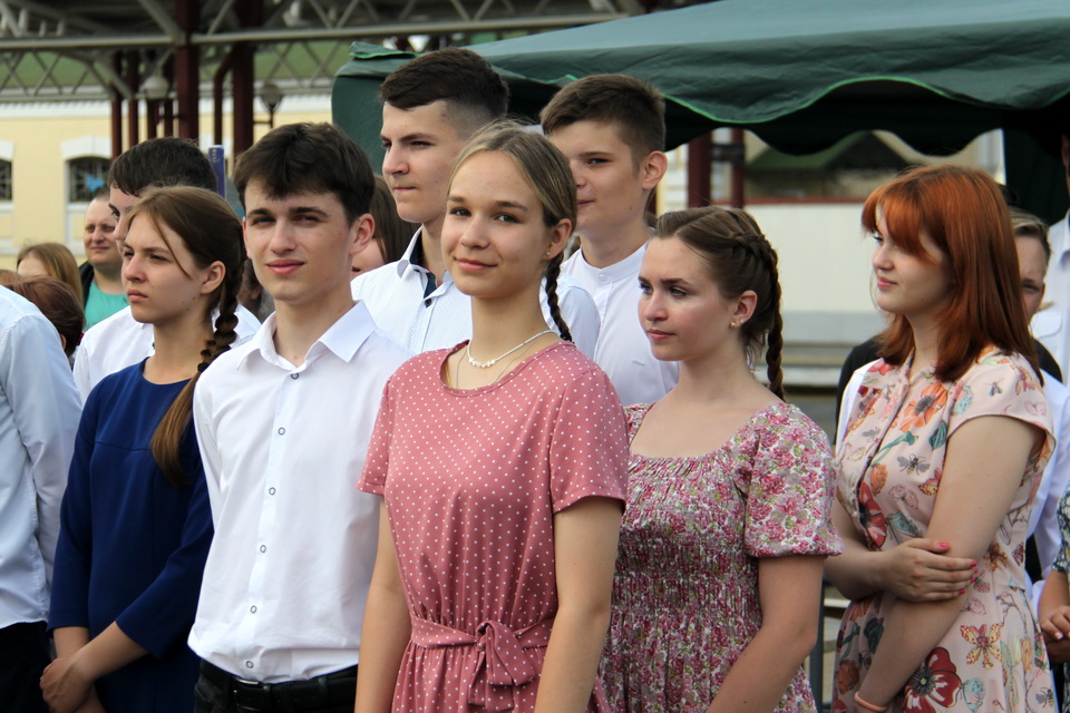 Встречая «Поезд Победы», учащиеся могилевских школ исполнили вальс Победы: 27 пар закружились на перроне. Среди них – выпускники средней школы №31 Алина Павлова и Роман Милевский.