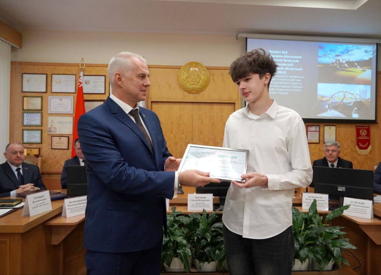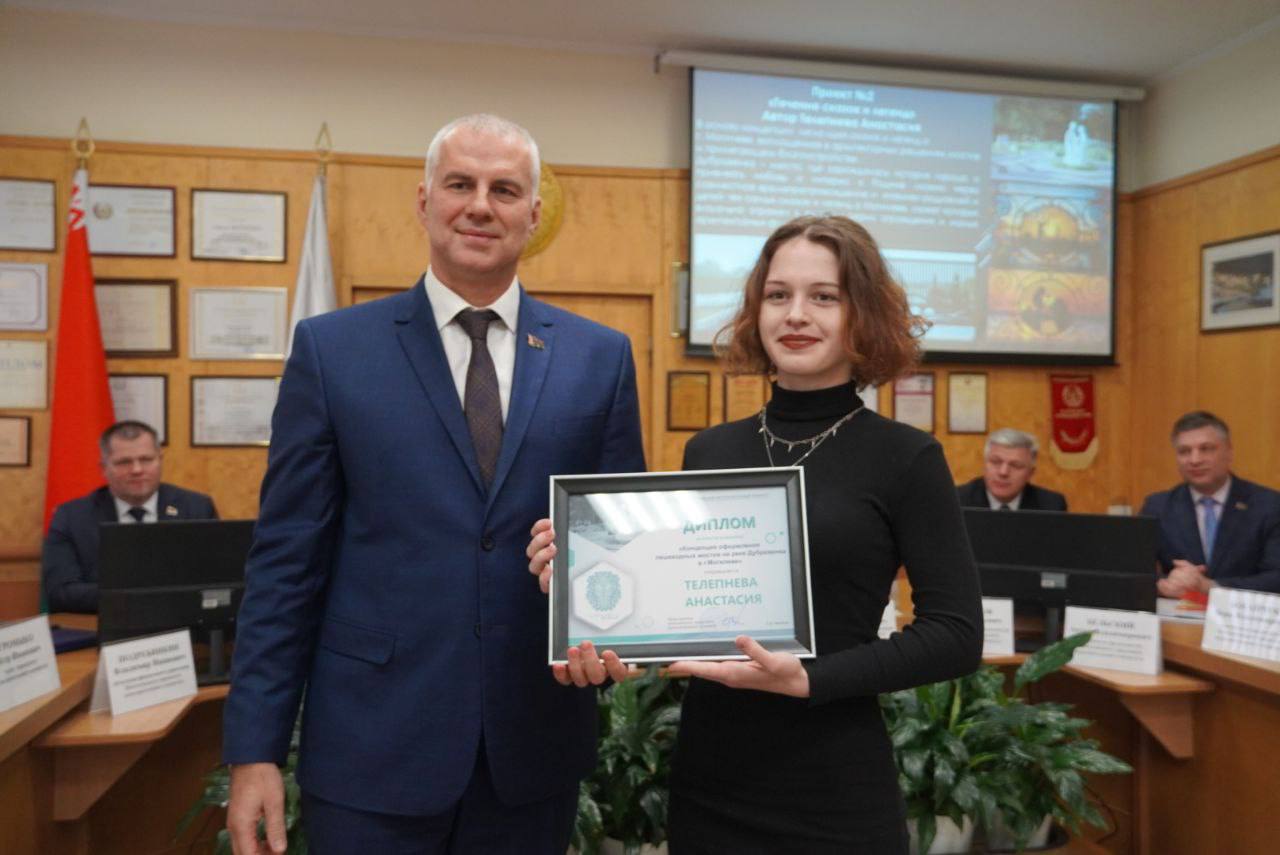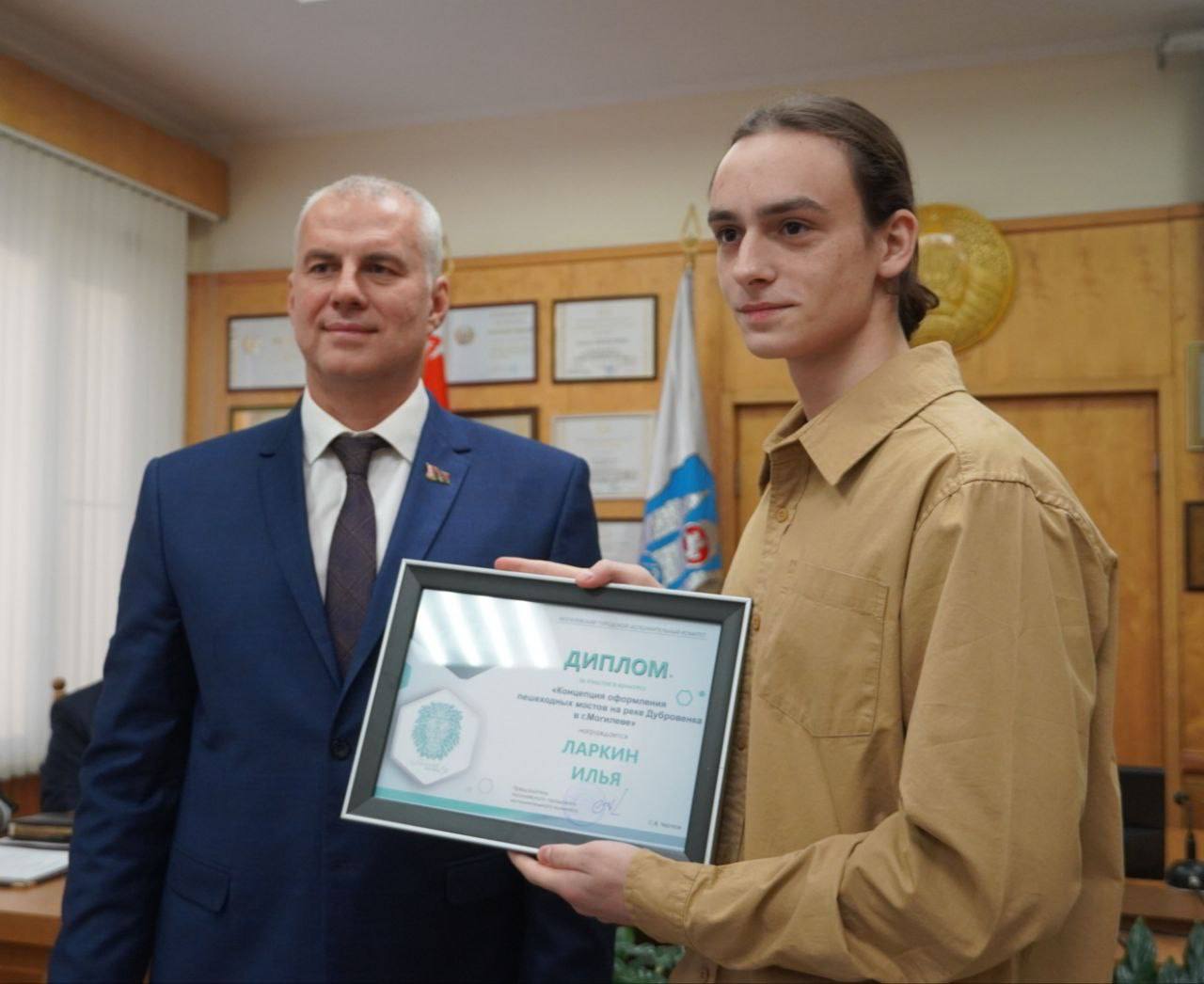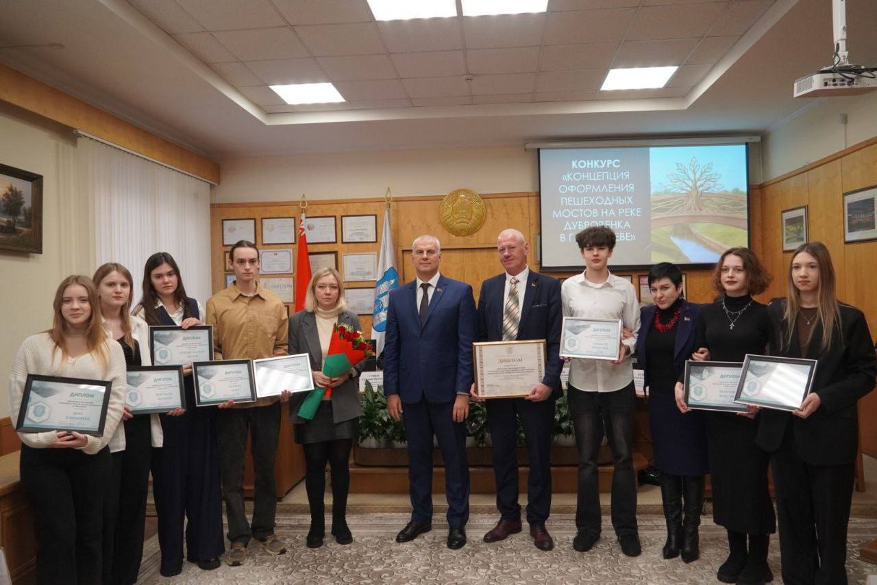 Конкурс проводился в один этап с 1 октября по 1 ноября. А сегодня были названы авторы лучших проектов. Они награждены дипломами и отмечены ценными подарками. Победителем конкурса «Концепция оформления пешеходных мостов на реке Дубровенка в г.Могилеве» стал Архитектурно- строительный колледж. Мэр Могилева Сергей Чертков пожелал ребятам дальнейших творческих успехов и поздравил с наступающим Новым годом.