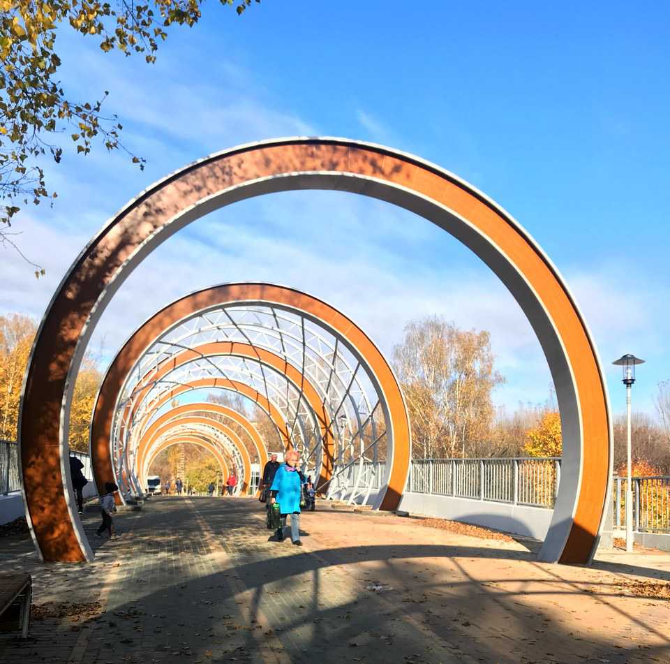 Арочная галерея с яркой подсветкой, оригинальными скамейками, пешеходной и велосипедными дорожками и даже несколькими торговыми павильонами превратили старый мост в современную зону отдыха, которая продолжается новой широкой лестницей в граните, которая ведет с моста на ул. Орловского. Здесь уже появились новые пешеходные дорожки, скамейки и светильники, планируется еще оборудование игровой зоны для детей.