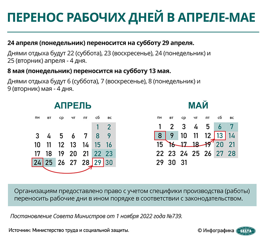 Амбулаторно-поликлинические организации здравоохранения, амбулаторно-поликлинические подразделения больниц и РНПЦ, организации службы крови, санитарно-эпидемиологические организации, аптеки, организации медтехники и организации особого типа 22, 24 апреля и 6, 8 мая будут работать по графику субботнего дня, 23, 30 апреля и 7, 14 мая — выходного дня, 25 апреля и 1, 9 мая — праздничного дня, 29 апреля и 13 мая — рабочего дня.
