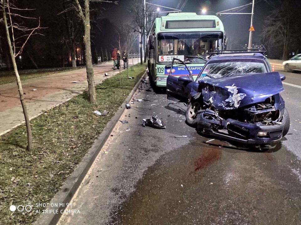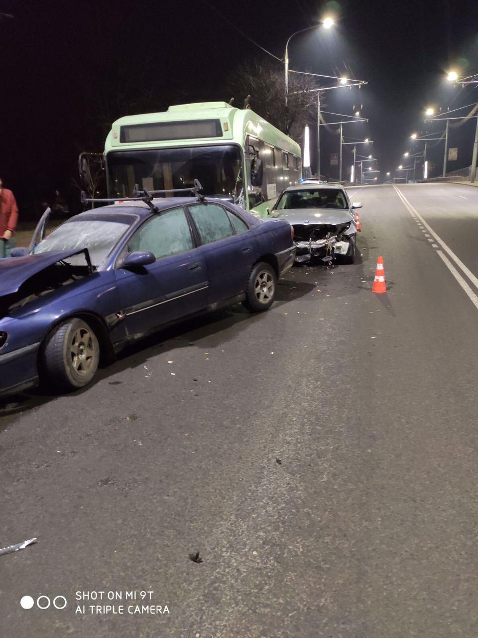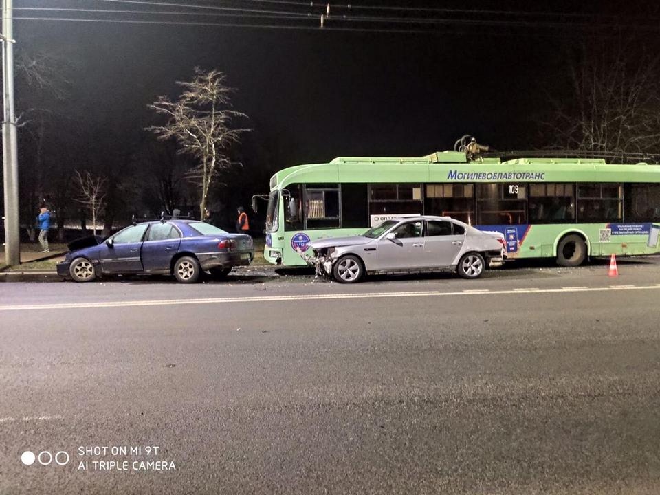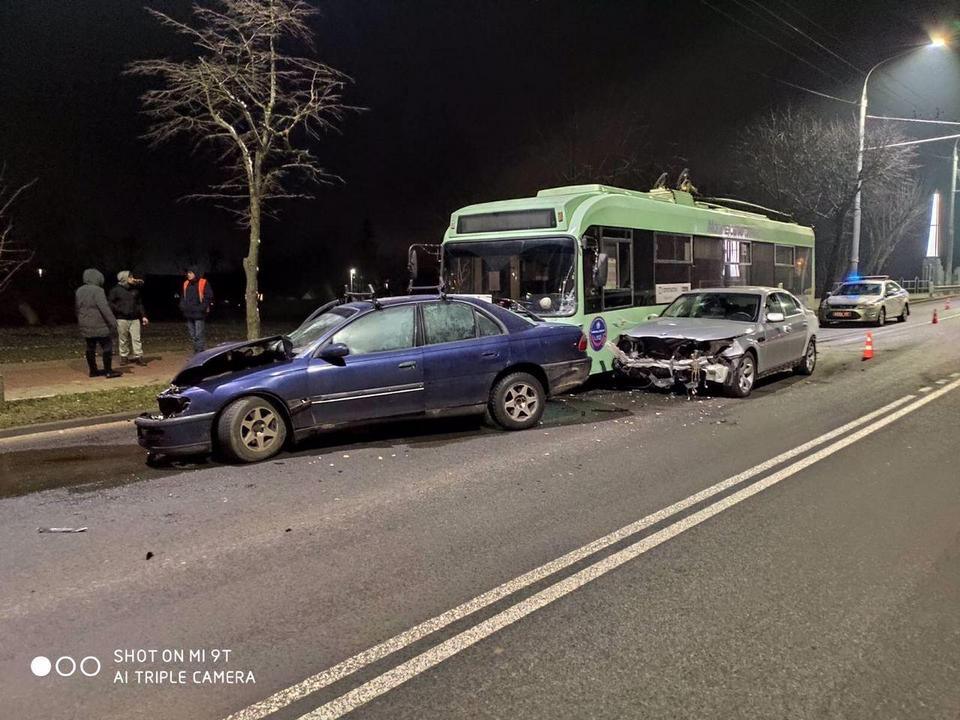 Как сообщили в отделении по агитации и пропаганде ГАИ УВД облисполкома, 71-летний местный житель на «Опеле» не справился с управлением автомобилем. Иномарка выехала на полосу встречного движения и врезалась в «БМВ», который от удара отбросило вправо, и он столкнулся с троллейбусом, двигавшимся в попутном направлении.