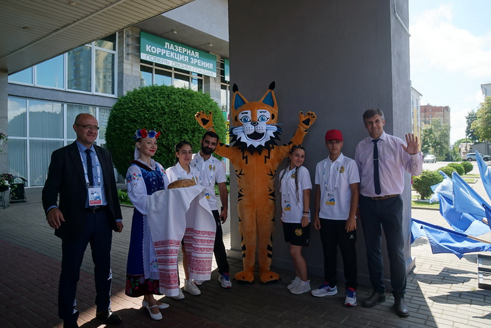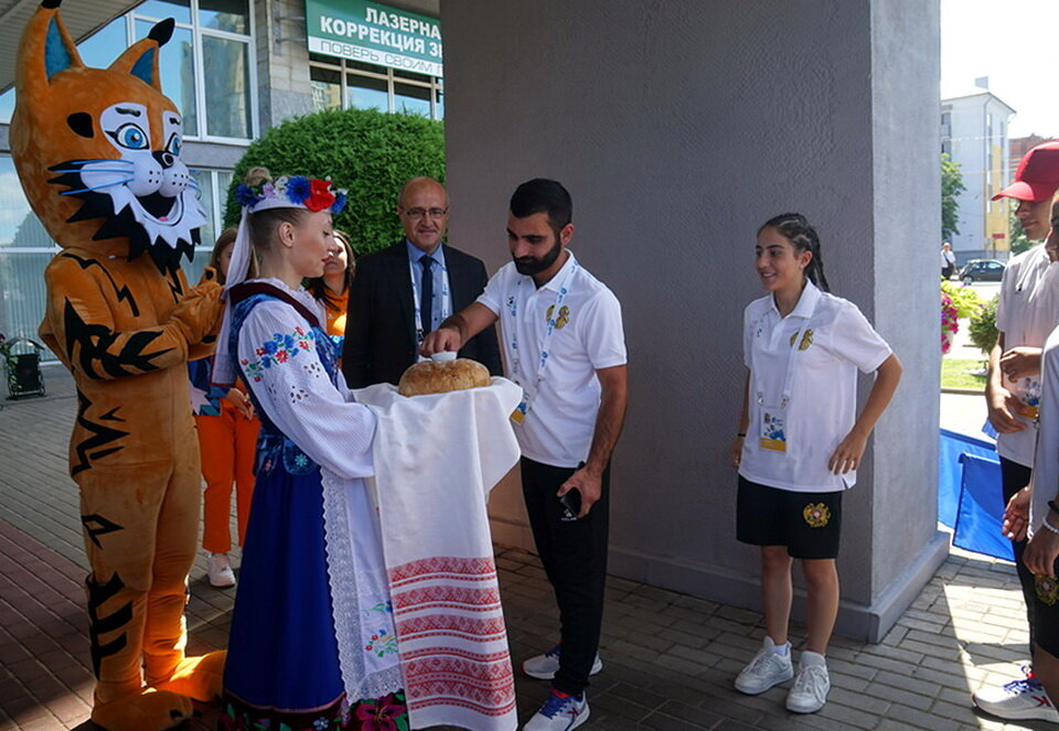 В Могилев прибыла сборная Армении по стрельбе из лука для участия во II Играх стран СНГ. Сегодня их встречали хлебом-солью организаторы соревнований, волонтеры и талисман Игр – Рыся.