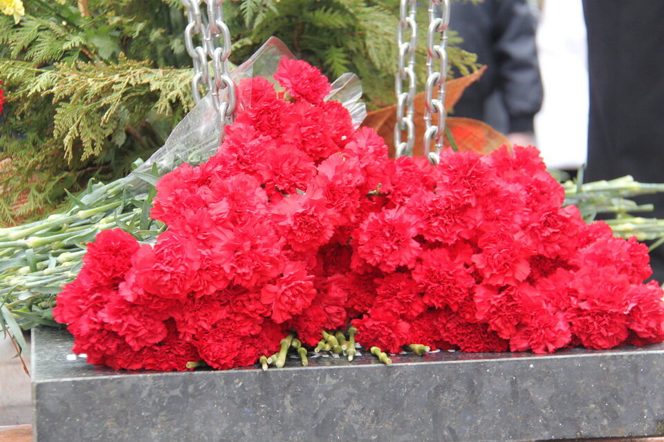 Они возложили цветы к знаку и почтили память жертв аварии минутой молчания.