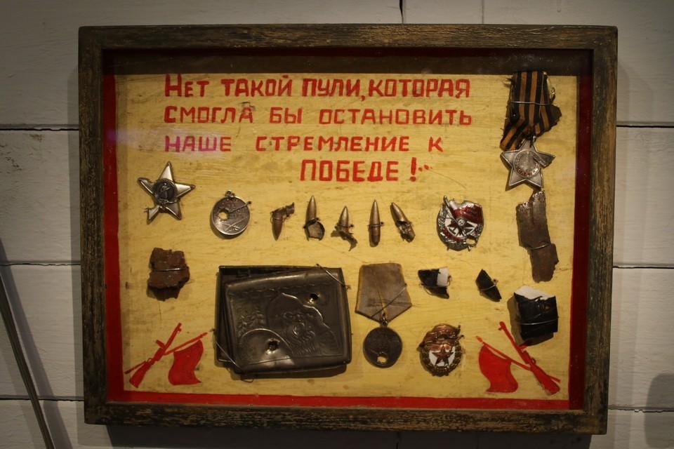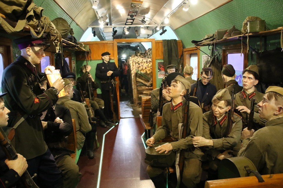 Дверь в тамбур открывает новую страницу военной летописи. Экспозиция построена на предельной достоверности. Ни в одном музее мира нет такого количества многофигурных композиций в скульптуре. В Поезде Победы же их более 150. Благодаря световым и звуковым эффектам воссоздаются захватывающие воздушные бои и массированные танковые атаки, картины походной солдатской жизни и тихие воспоминания мирного довоенного времени. Все это делает экспозицию более проникновенной, а ощущения от увиденного – более острыми. Посетитель не смотрит на экспозицию отстраненно, с позиции экскурсанта. Он здесь. Он в поезде. Едет вместе с пассажирами в страшное будущее. Можно, кстати, потрогать вещи попутчиков: куртки, одеяла, велосипеды. Большая часть из 4 тысяч единиц реквизита – оригинальная.